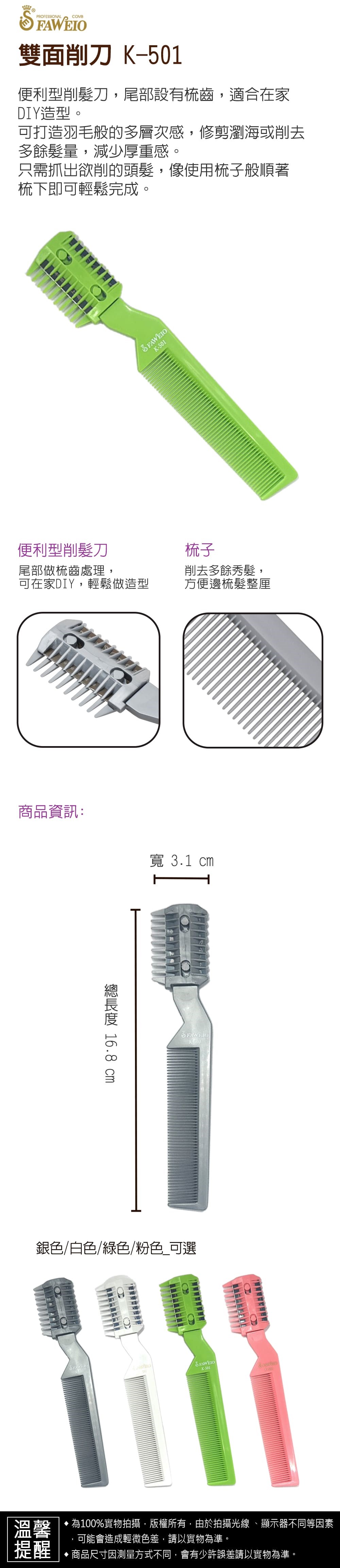 商品規格 : 品牌名稱 : 髮葳鵝 商品品名 : 雙面削刀 K-501 商品尺寸 : 總長度16.8㎝ x 寬3.1㎝ 商品材質 : 塑膠+刀片