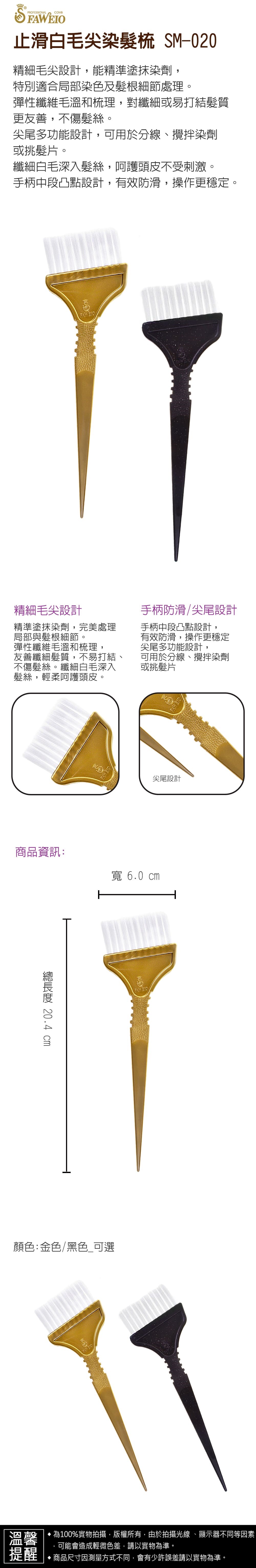 商品規格 : 品牌名稱 : 髮葳鵝 商品品名 : 止滑白毛尖染髮梳 SM-020 商品尺寸 : 總長度20.4㎝ x 寬6.0㎝ 商品顏色 : (二色可選) SM-020-1_金色 SM-020-2_黑色