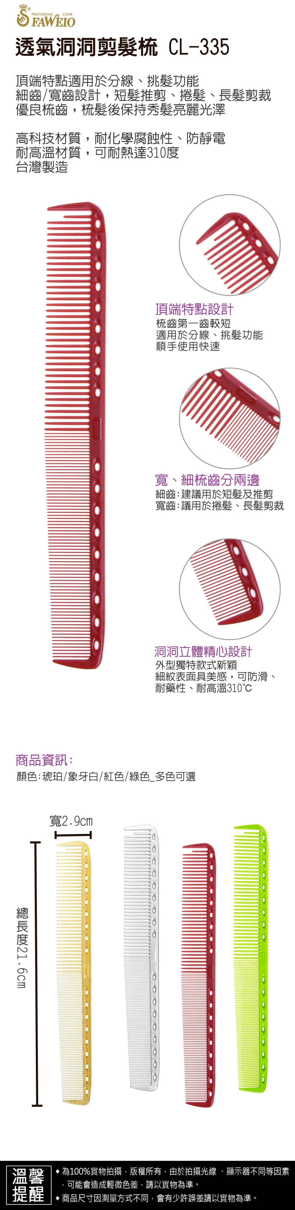*精心設計其外型獨特款式新穎 *洞洞立體細紋表面具美感,可防滑、耐藥性、耐高溫和入髮性能好 *梳齒第一齒較短為分線分區使用,非故障品、寬、細梳齒分兩邊 *密齒建議用於短髮及推剪, 剪裁時好梳理,連結點更加柔順 *寬齒建議用於捲髮、長髮剪裁時更好梳理及分線 *耐熱溫度 310℃ *抗藥性佳,耐酸度強。 *疏密齒設計,方便整理不同髮型。 *台灣製造品質保證