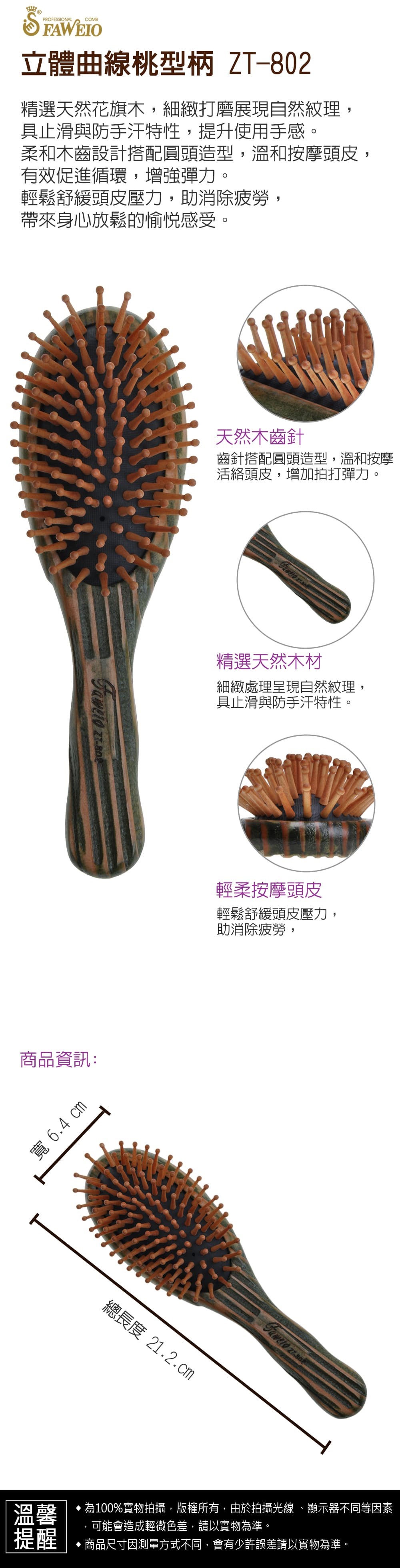 商品規格 : 品牌名稱 : 髮葳鵝 商品品名 : 立體曲線桃型柄 ZT-802 商品尺寸 : 總長度21.2cm x 寬6.4cm