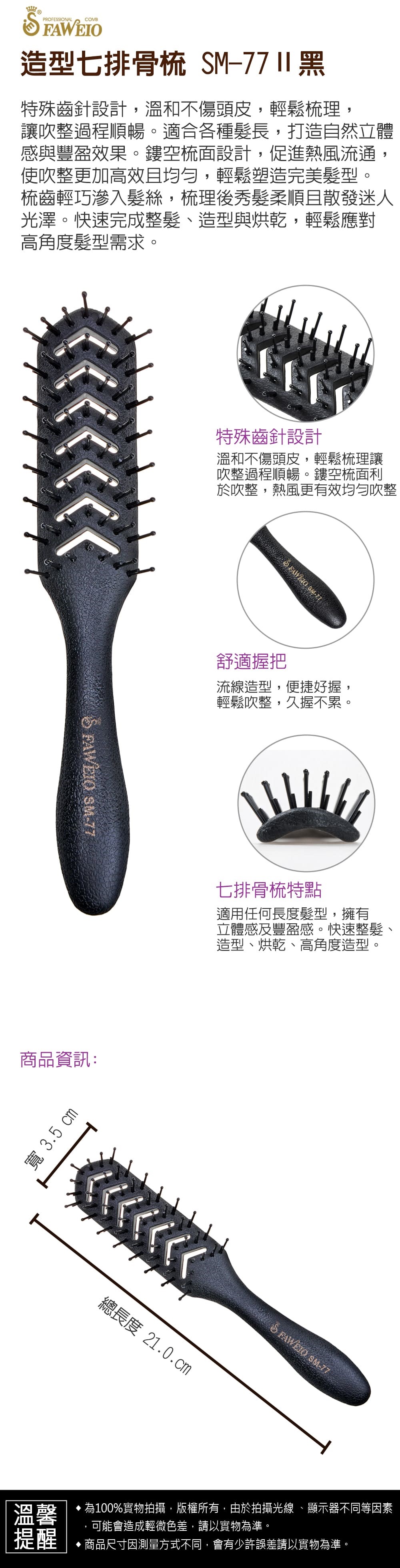 商品規格 : 品牌名稱 : 髮葳鵝 商品品名 : 造型七排骨梳 SM-77Ⅱ黑 商品尺寸 : 總長度21.0cm x 寬3.5cm