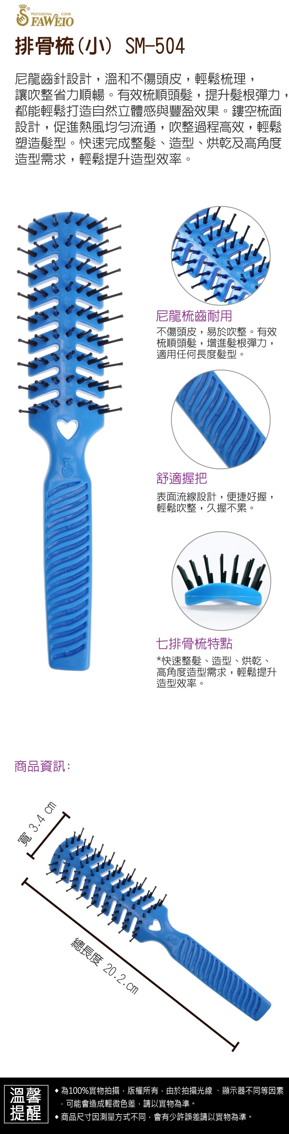 商品規格 : 品牌名稱 : 髮葳鵝 商品品名 : 排骨梳(小) SM-504 商品尺寸 : 總長度20.2cm x 寬3.4cm 商品顏色 : (三款可選) SM-504-1 銀色 SM-504-2 藍色 SM-504-3 綠色