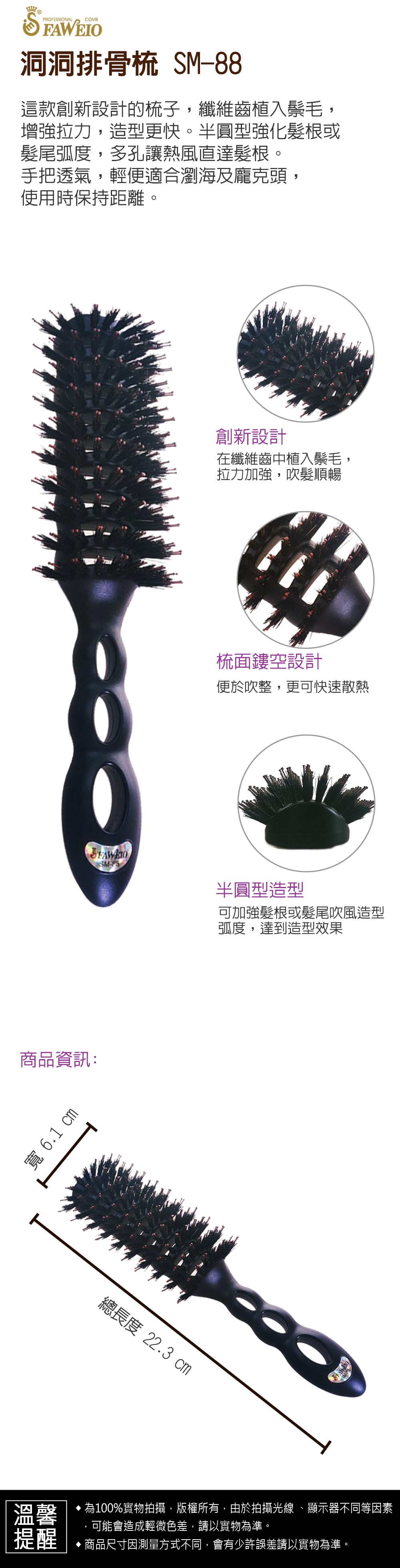 創新設計,在纖維齒中植入鬃毛,拉力加強,吹髮順暢 半圓型造型可加強髮根或髮尾吹風造型弧度 多孔設計,可讓熱風直達髮根,輕易達到吹整效果 適合吹瀏海和龐克頭,是髮型師的首要選擇