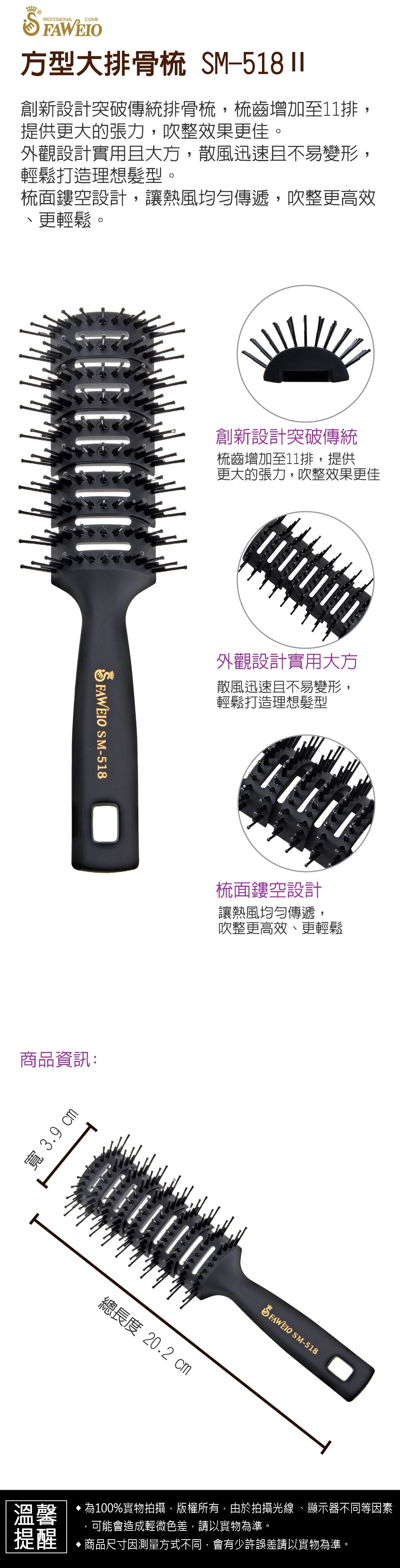 *創新設計改變排骨梳的傳統作法,增加至11排的梳齒,張力更大、更好吹整。 *外觀設計實用大方,散風快且不易變形,能迅速整出最佳造型。 *梳面鏤空設計,利於吹整時熱風更有效及均勻地吹整髮