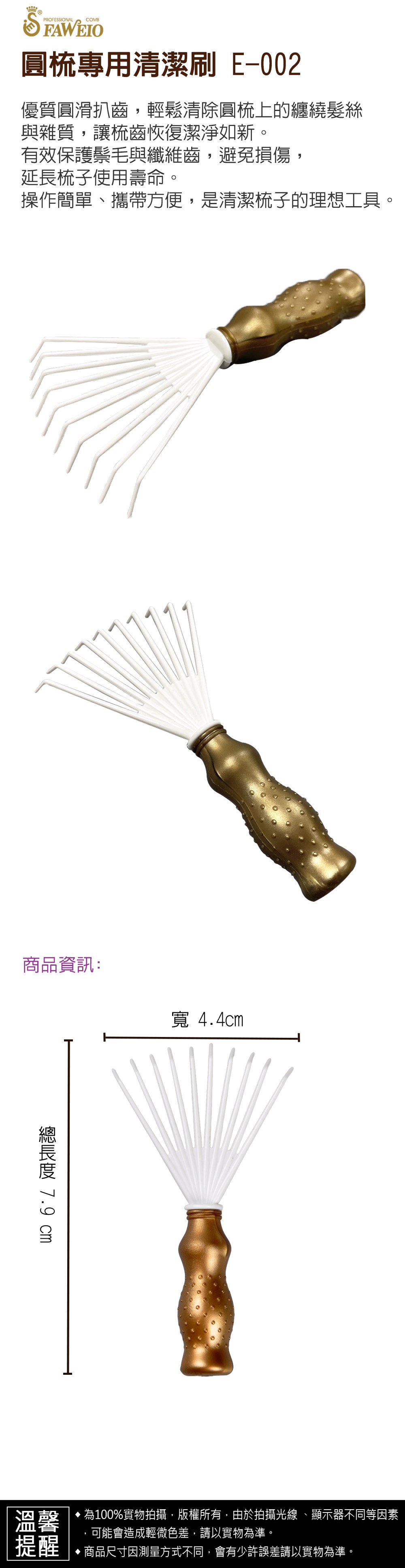 商品規格 : 品牌名稱 : 髮葳鵝 商品品名 : 圓梳專用清潔刷 E-002 商品尺寸 : 總長度7.9㎝ x 寬4.4㎝ 商品材質 : 塑膠