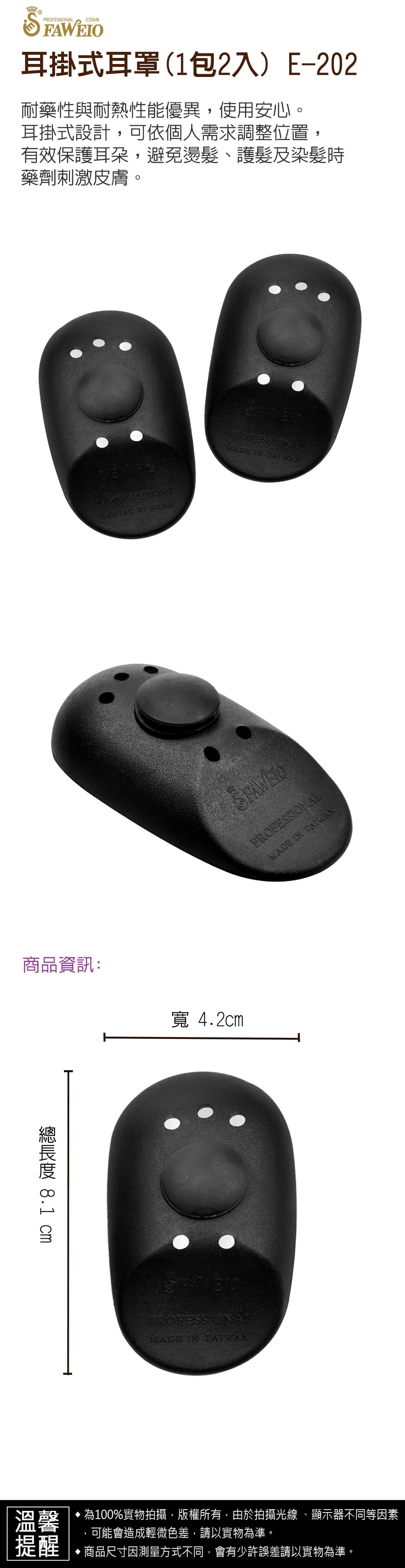 商品規格 : 品牌名稱 : 髮葳鵝 商品品名 : 耳掛式耳罩 (1包2入) E-202 ( 商品尺寸 : 總長度8.1㎝ x 寬4.2㎝(單一個)