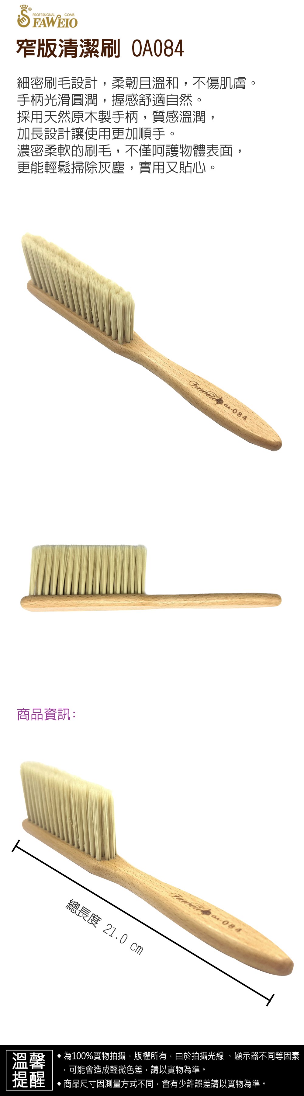 商品規格 : 品牌名稱 : 髮葳鵝 商品品名 : 窄版清潔刷 OA084 商品尺寸 : 總長度21.0㎝ x 寬2.20㎝ 商品材質 : 原木+纖維毛 注意事項 : 1.尺寸為手工測量,因測量方式不同,會有少許誤差!皆以實品為準。 2.請經常清潔,使用後輕拍毛刷即可將雜物清除。 3.避免水氣。 4.置於乾燥陰涼處。