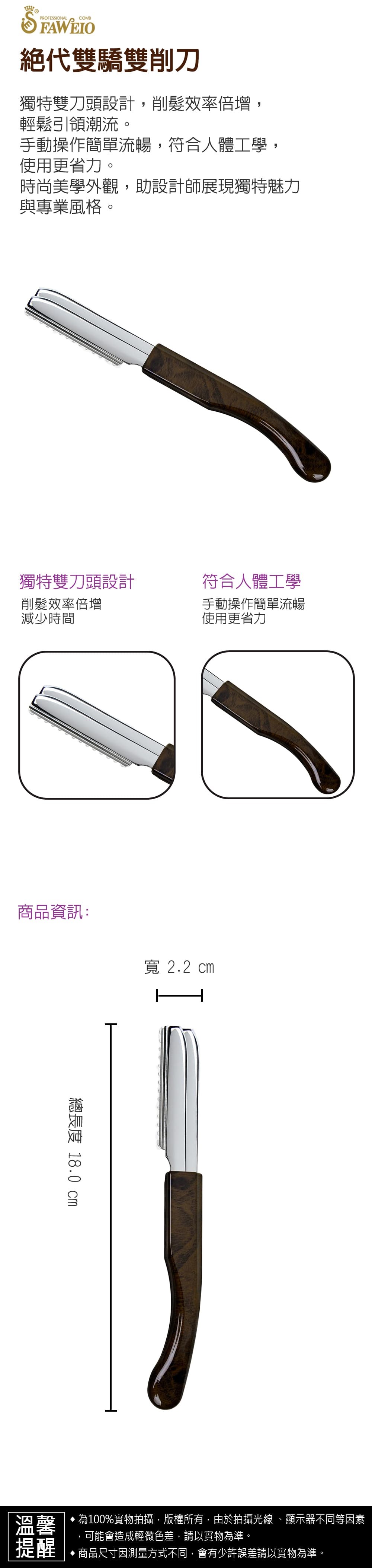 商品規格 : 品牌名稱 : 髮葳鵝 商品品名 : 絕代雙驕雙削刀 商品尺寸 : 總長度18.0㎝ x 寬2.2㎝ 商品材質 : 塑膠+雙刀片