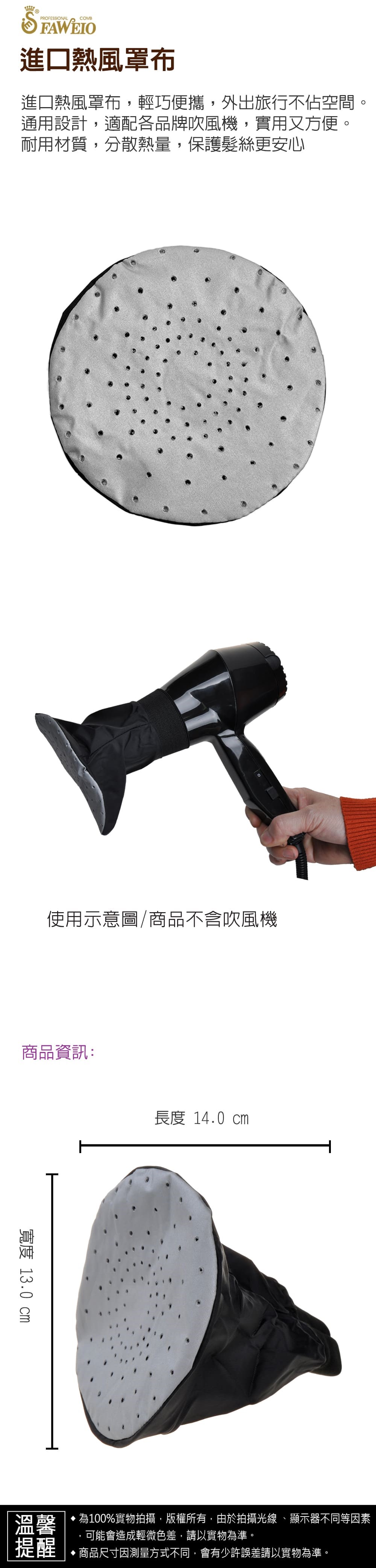 商品規格 : 品牌名稱 : 髮葳鵝 商品品名 : 進口熱風罩布 商品尺寸 : 總長度14.0㎝ x 寬13.0㎝ 商品材質 : 布