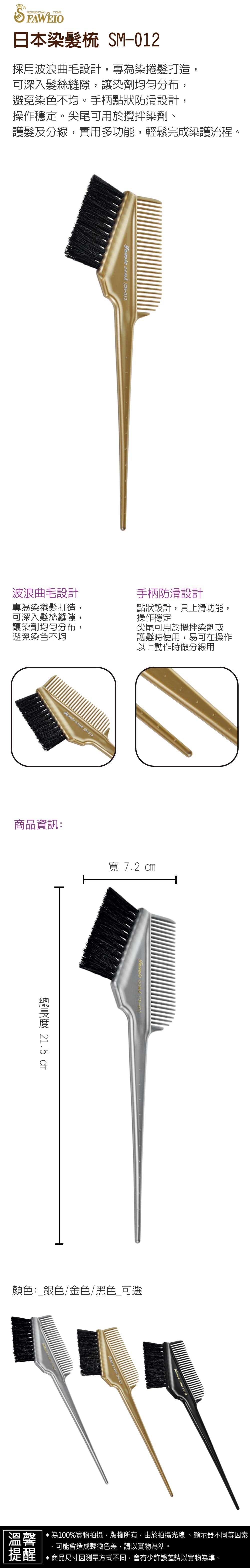 商品規格 : 品牌名稱 : 髮葳鵝 商品品名 : 日本染髮梳 SM-012 商品尺寸 : 總長度21.5㎝ x 寬7.2㎝ 商品顏色 : (三色可選) SM-012-1 金色 SM-012-2_銀色 SM-012-3_黑色