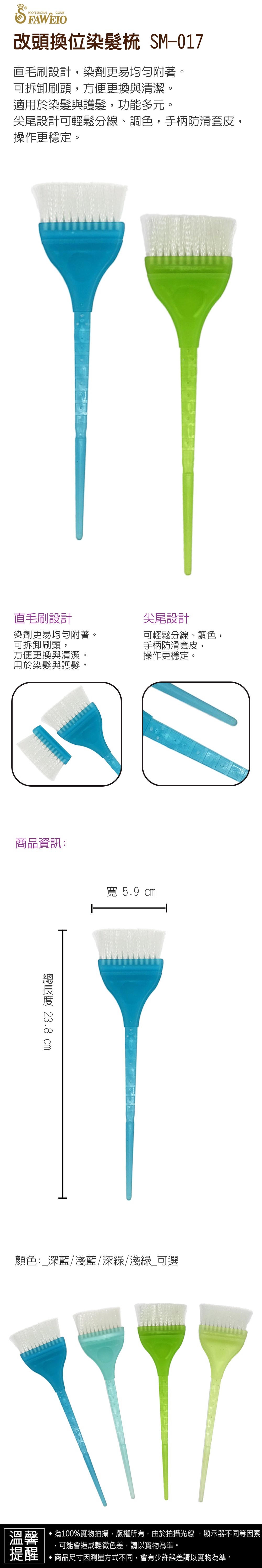 商品規格 : 品牌名稱 : 髮葳鵝 商品品名 : 改頭換位染髮梳 SM-017 商品尺寸 : 總長度23.8㎝ x 寬5.9㎝ 商品顏色 : SM-017-1_深藍、淺藍_可選 SM-017-2_深綠、淺綠_可選