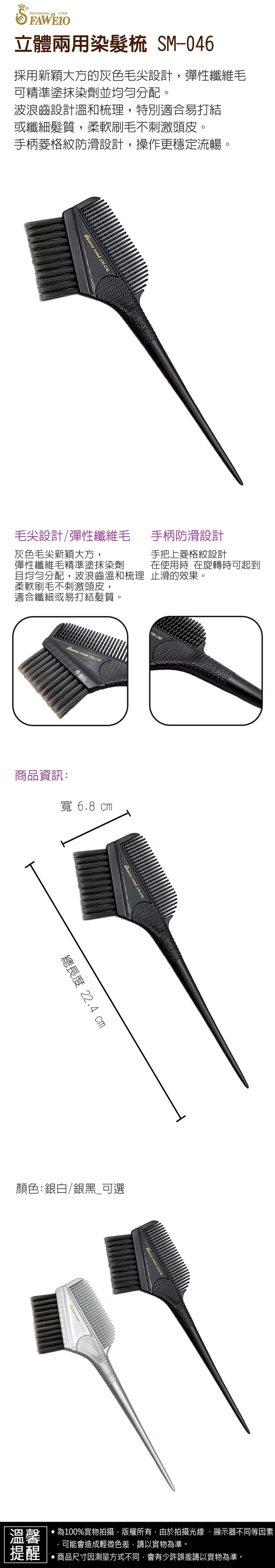 商品規格 : 品牌名稱 : 髮葳鵝 商品品名 : 立體兩用染髮梳 SM-046 商品尺寸 : 總長度22.4㎝ x 寬6.8㎝ 商品顏色 : (二色可選) SM-046-1_銀白 SM-046-2_銀黑