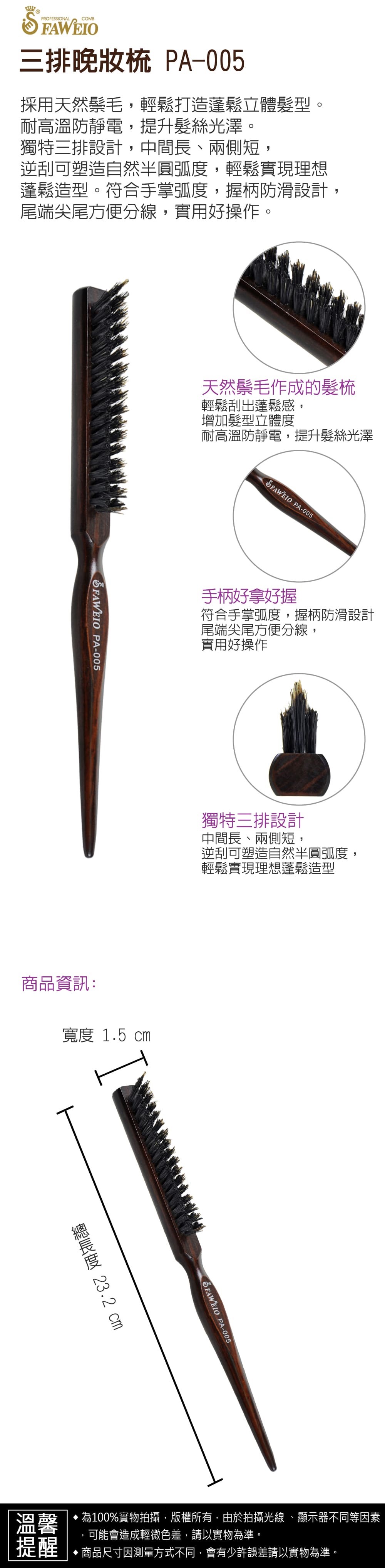 商品規格 : 品牌名稱 : 髮葳鵝 商品品名 : 三排晚妝梳 PA-005 商品尺寸 : 總長度23.2cm x 寬度1.5㎝ 商品材質 : 木頭+鬃毛 注意事項 : 1.尺寸為手工測量,因測量方式不同,會有少許誤差!皆以實品為準。 2.避免高處落下。 3.定期挑掉纏繞在梳間的頭髮。 4.定期刷掉梳齒上積存的油脂塵垢。 5.請勿置於潮濕地方,以免聚毛受潮發霉。