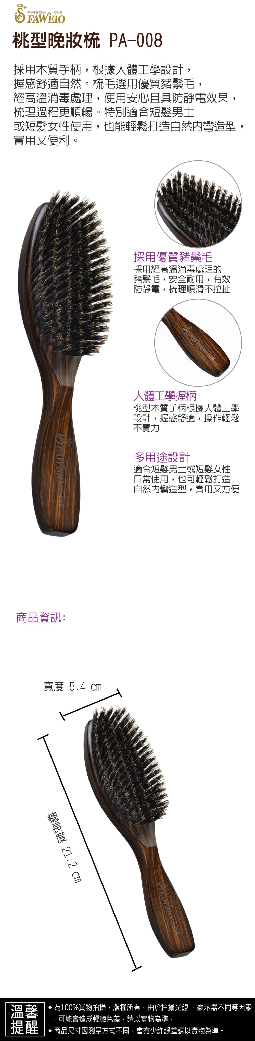 *桃型木質手柄根據人體工學設計而成,握感舒適。 *鬃毛採用優質豬鬃毛,經高温消毒處理使用安心,具防靜電效果 *適用一般較短頭髮男生,或短髮女性使用,也可以做一點點的內彎使用。