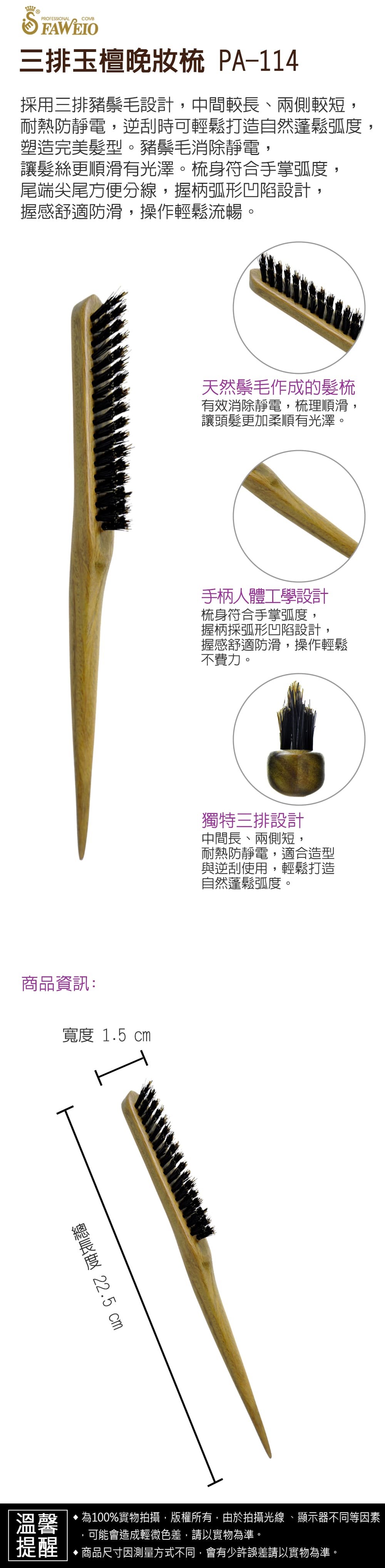 商品規格 : 品牌名稱 : 髮葳鵝 商品品名 : 三排玉檀晚妝梳 PA-114 商品尺寸 : 總長度22.5cm x 寬度1.5cm 商品材質 : 綠檀木+鬃毛
