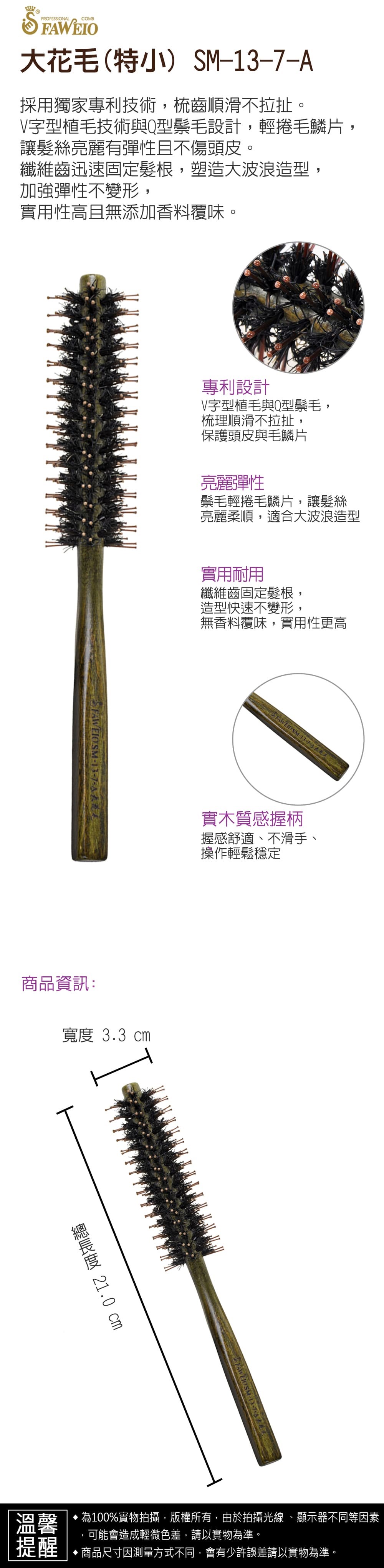 商品規格 : 品牌名稱 : 髮葳鵝 商品品名 : 大花毛(特小) SM-13-7-A 商品尺寸 : 總長度21cm x 寬3.3cm、植毛長度10.1cm 商品材質 : 木頭/鬃毛+尼龍