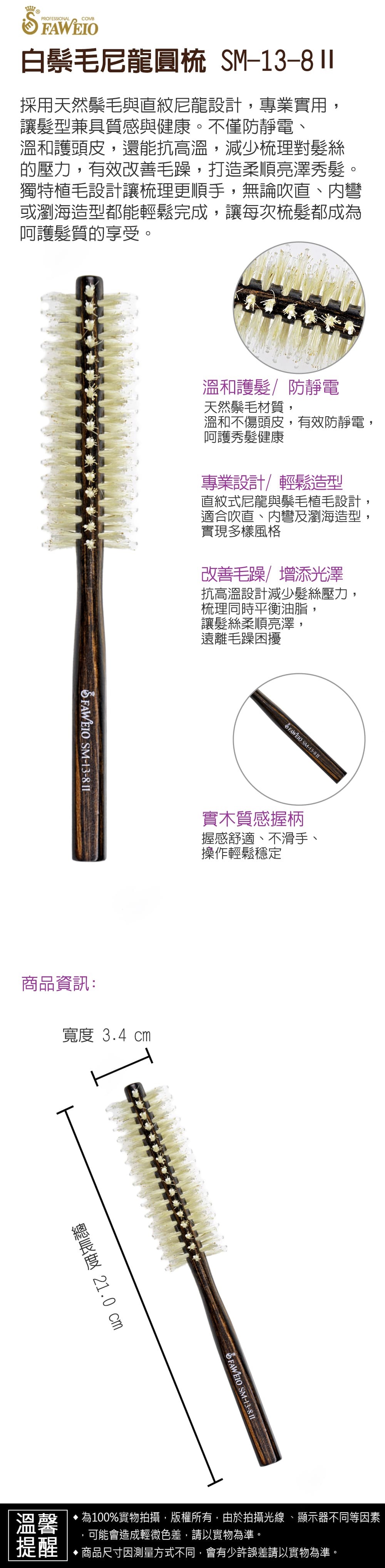 商品規格 : 品牌名稱 : 髮葳鵝 商品品名 : 白鬃毛尼龍圓梳 SM-13-8Ⅱ 特小(8排) 商品尺寸 : 總長度21cm x 寬3.4cm、植毛長度10.1cm 商品材質 : 木頭/鬃毛+尼龍