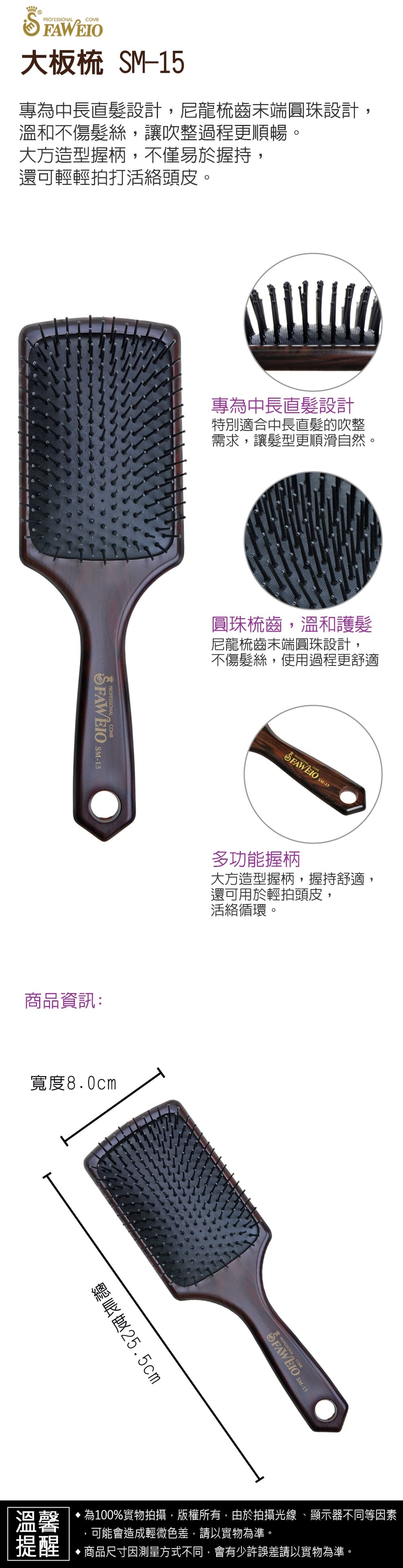 商品規格 : 品牌名稱 : 髮葳鵝 商品品名 : 大板梳 SM-15 商品尺寸 : 總長度25.5cm x 寬8cm 商品材質 : 塑膠