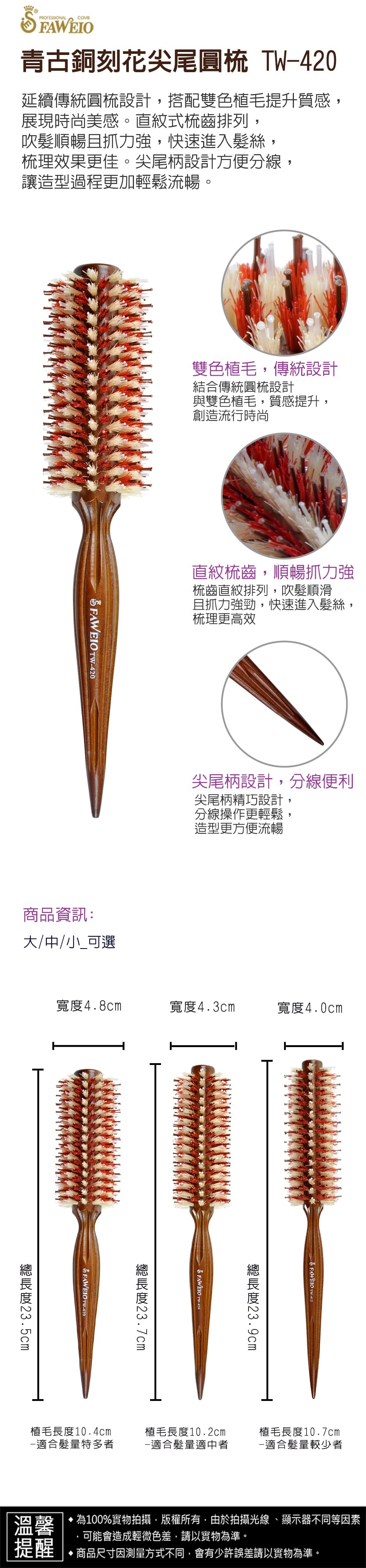 總長度23.5cm x 寬4.8cm、植毛長度10.4cm-適合髮量特多者