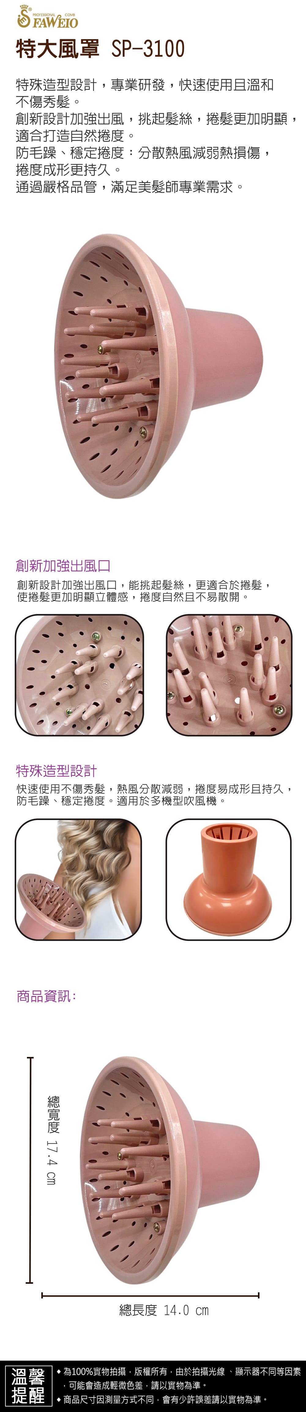 *特殊造型研發設計,使用快速不傷害秀髮。 *創新設計加強出風口,能挑起髮絲,更適合於捲髮,使捲髮更加明顯。 *使用風罩捲度不易散開,不易產生毛躁傷害秀髮。 *使用風罩烘乾,會使熱風分散減弱,捲度容易成形維持。 *嚴格品管,適合美髮師專業用途。