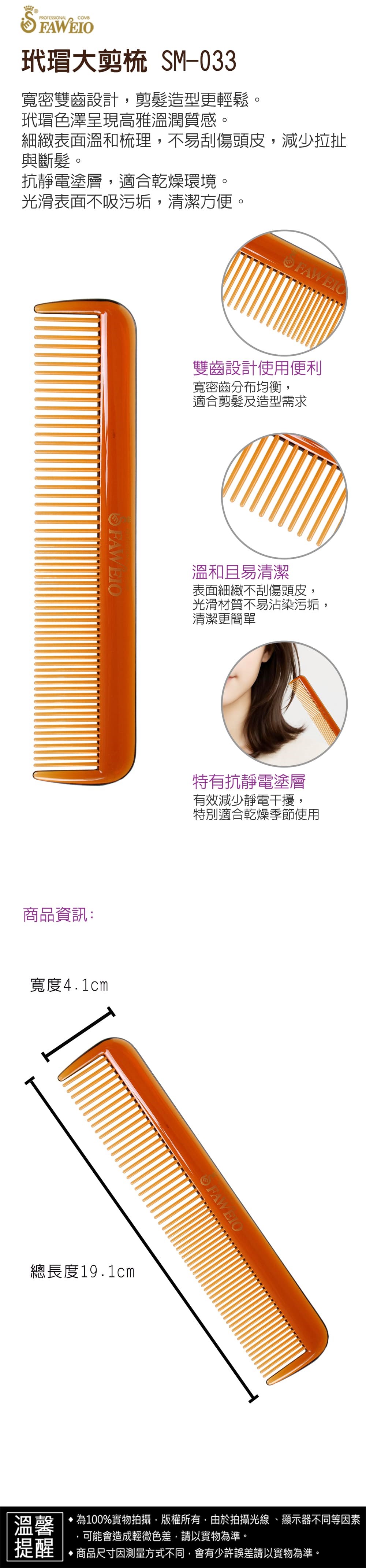 商品規格 : 品牌名稱 : 髮葳鵝 商品品名 : 玳瑁大剪梳 SM-033 商品尺寸 : 總長度19.1㎝ x 寬4.1㎝ 商品材質 : 塑膠