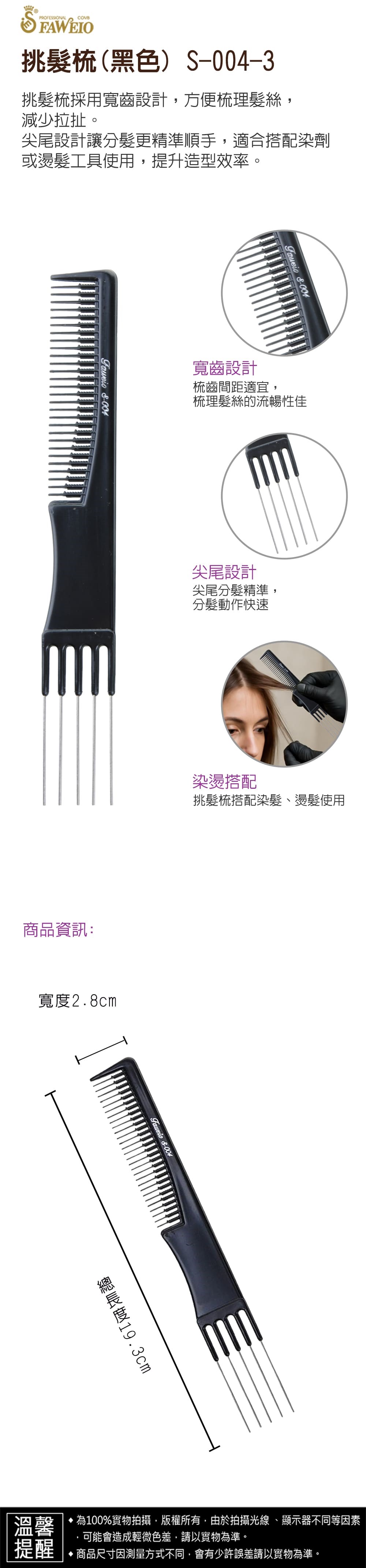 商品規格 : 品牌名稱 : 髮葳鵝 商品品名 : 挑髮梳(黑色) S-004-3 商品尺寸 : 總長度19.3㎝ x 寬2.8㎝ 商品材質 : 塑膠