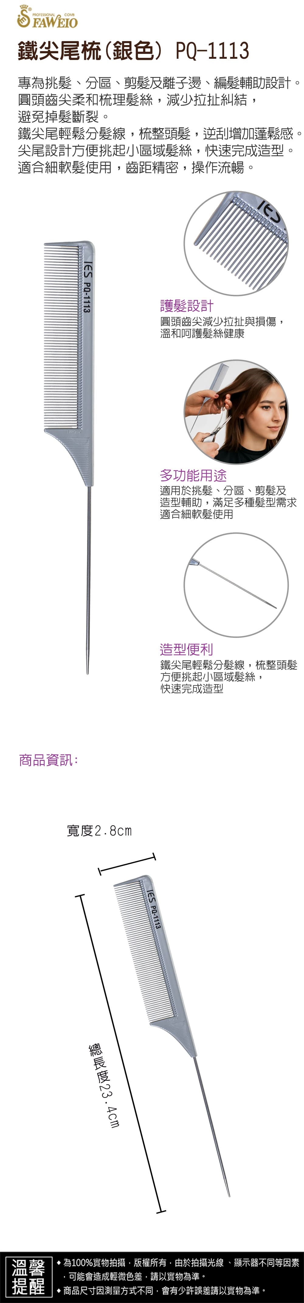 商品規格 : 品牌名稱 : 髮葳鵝 商品品名 : 鐡尖尾梳(銀色) PQ-1113 商品尺寸 : 總長度23.4㎝ x 寬2.8㎝ 商品材質 : 塑膠+鐡