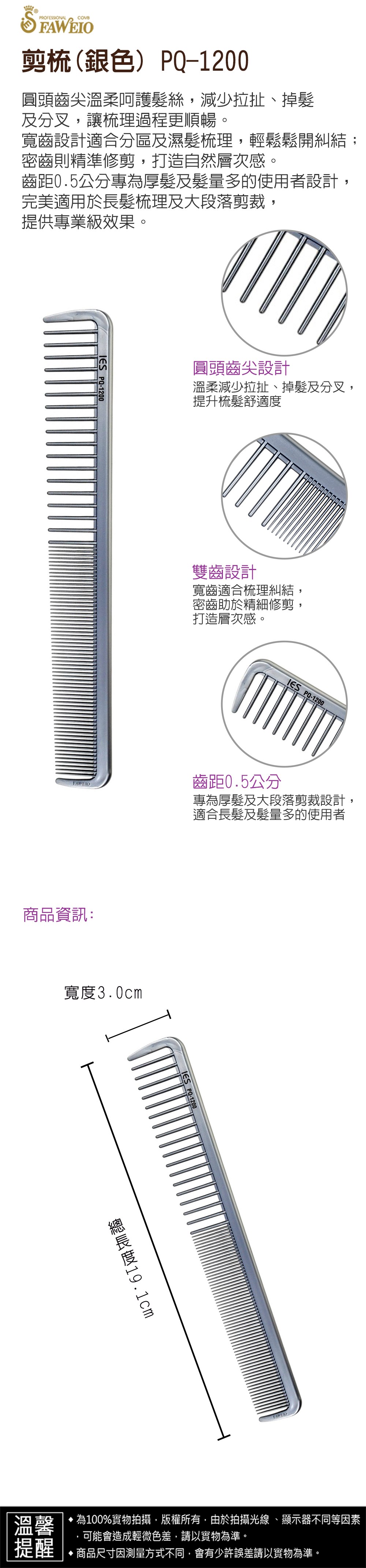 商品規格 : 品牌名稱 : 髮葳鵝 商品品名 : 剪梳(銀色) PQ-1200 商品尺寸 : 總長度19.1㎝ x 寬3.0㎝ 商品材質 : 塑膠