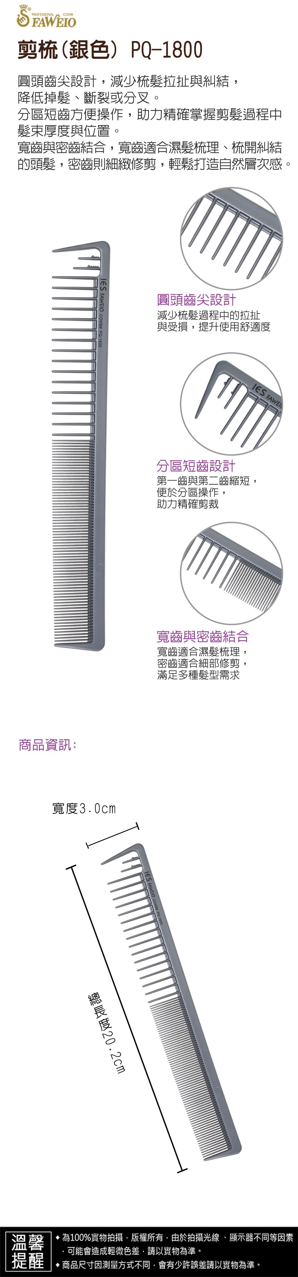 商品規格 : 品牌名稱 : 髮葳鵝 商品品名 : 剪梳(銀色) PQ-1800 商品尺寸 : 總長度20.2㎝ x 寬3.0㎝ 商品材質 : 塑膠