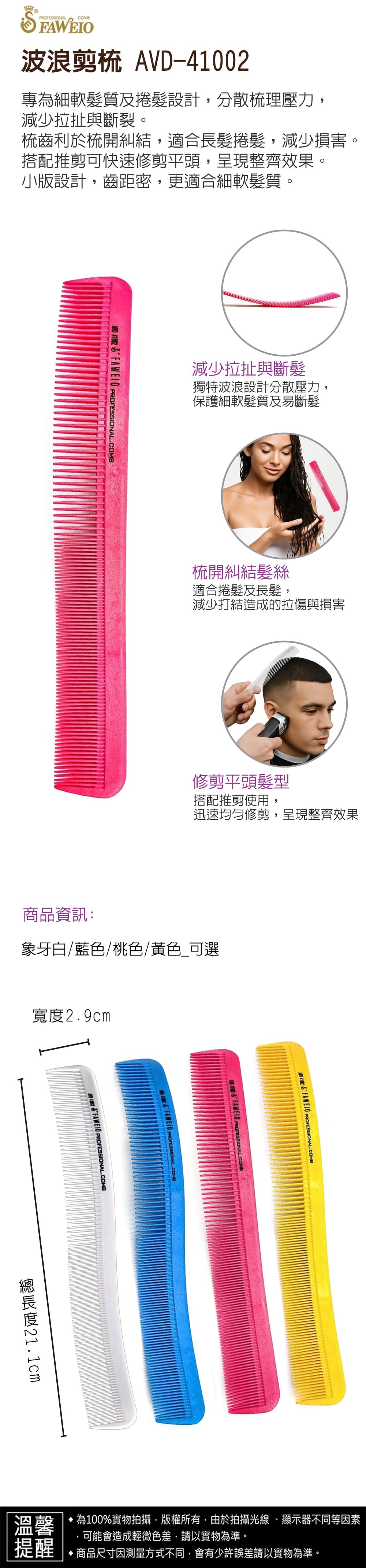 商品規格 : 品牌名稱 : 髮葳鵝 商品品名 : 波浪剪梳 AVD-41002 商品尺寸 : 總長度21.1㎝ x 寬2.9㎝ 商品顏色 : 多色可選 AVD-41002 象牙白 AVD-41002-1 藍色 AVD-41002-2 桃色 AVD-41002-3 黃色