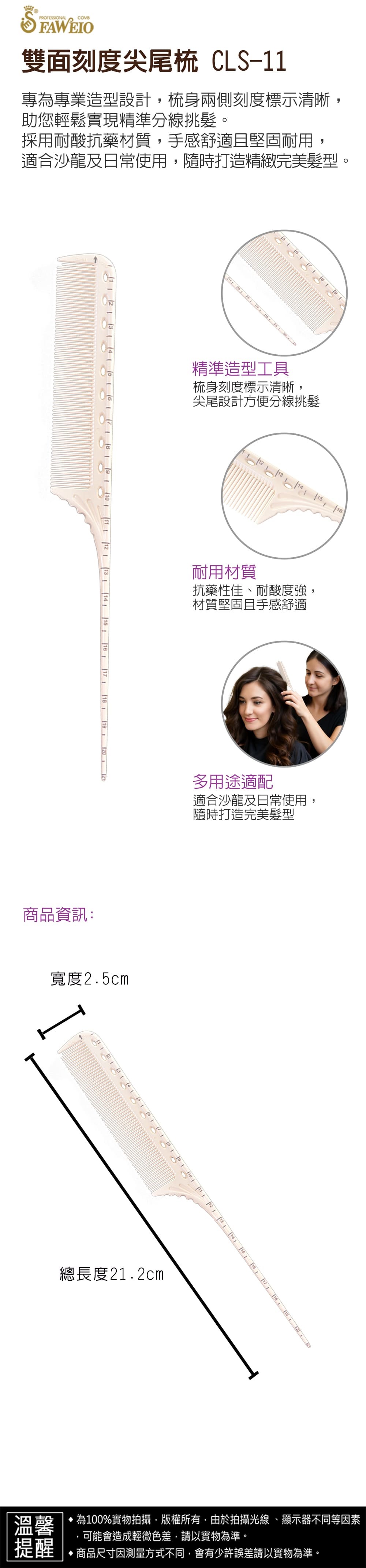 商品規格 : 品牌名稱 : 髮葳鵝 商品品名 : 雙面刻度尖尾梳(象牙白) CLS-11 商品尺寸 : 總長度21.2cm x 寬2.5cm 商品材質 : 高性能工程塑膠