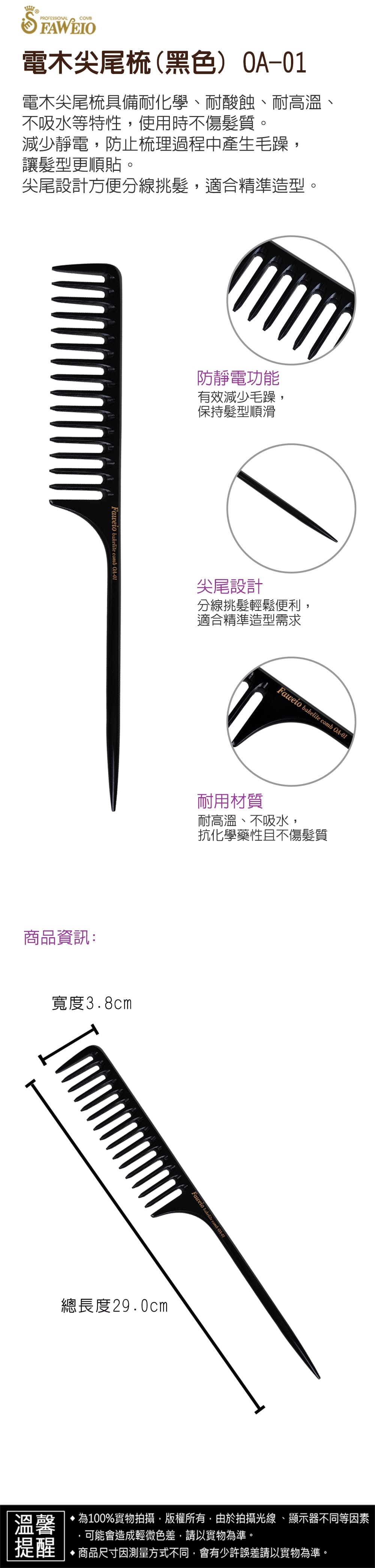 商品規格 : 品牌名稱 : 髮葳鵝 商品品名 : 電木尖尾梳 (黑色) OA-01 商品尺寸 : 總長度29.0cm x 寬3.8cm 商品材質 : 電木板