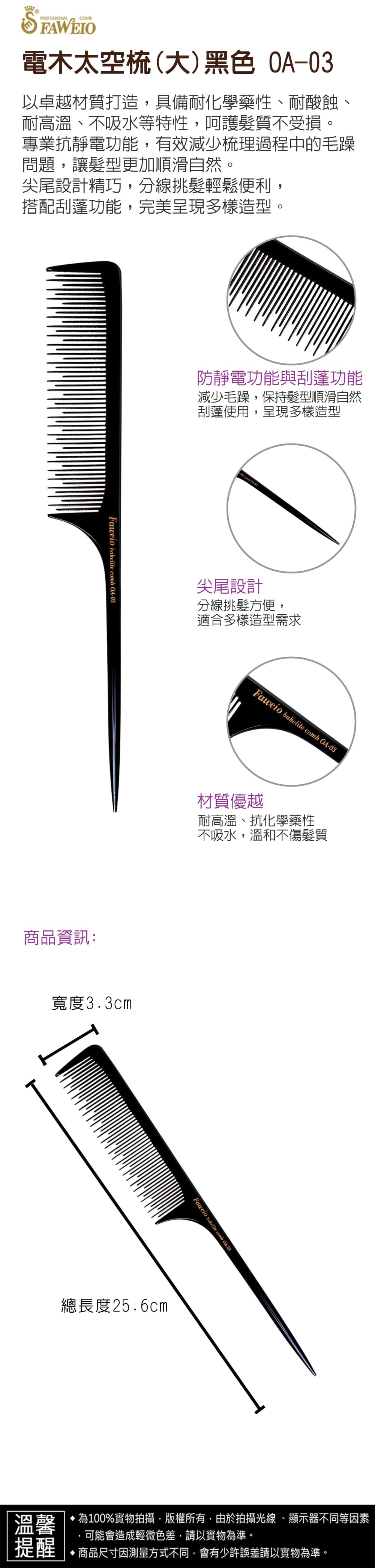 商品規格 : 品牌名稱 : 髮葳鵝 商品品名 : 電木太空梳(大) 黑色 OA-03 商品尺寸 : 總長度25.6cm x 寬3.3cm 商品材質 : 電木板