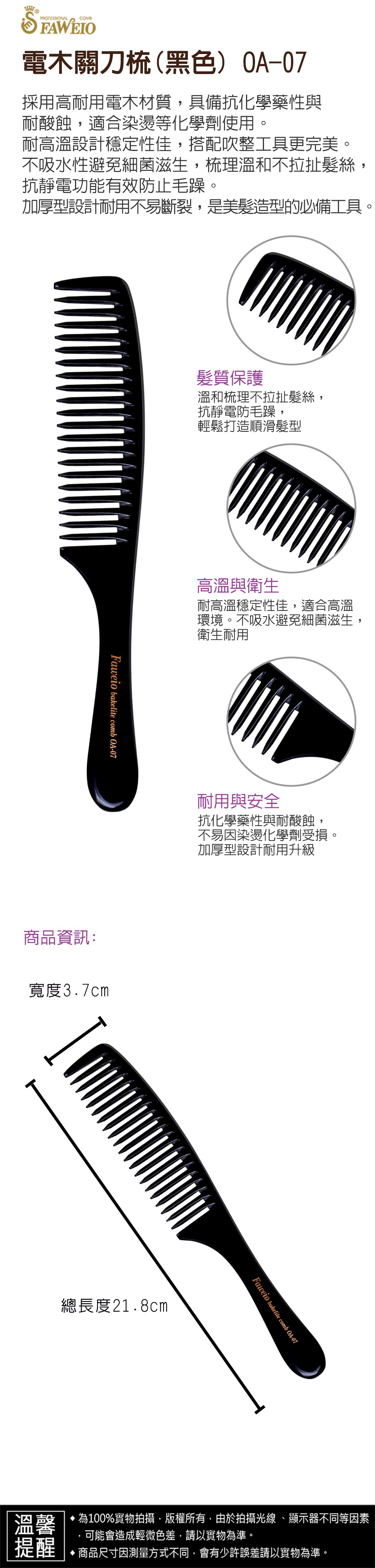 商品規格 : 品牌名稱 : 髮葳鵝 商品品名 : 電木關刀梳(黑色) OA-07 商品尺寸 : 總長度21.8cm x 寬3.7cm 商品材質 : 電木板