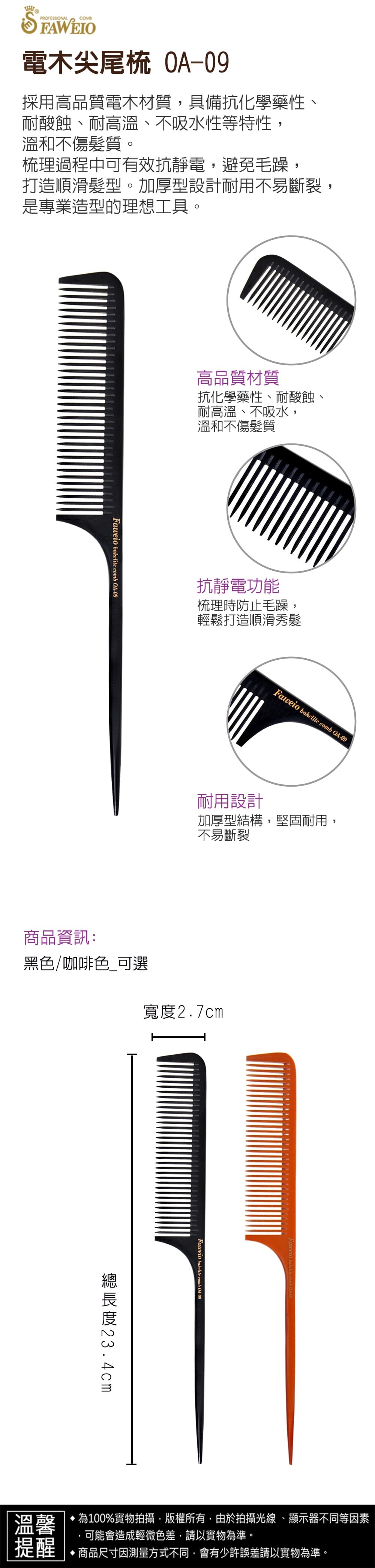 商品規格 : 品牌名稱 : 髮葳鵝 商品品名 : 電木尖尾梳 OA-09 商品尺寸 : 總長度23.4cm x 寬2.7cm 商品顏色 : 二色可選 OA-09-1 _黑色 OA-09-2 _咖啡色