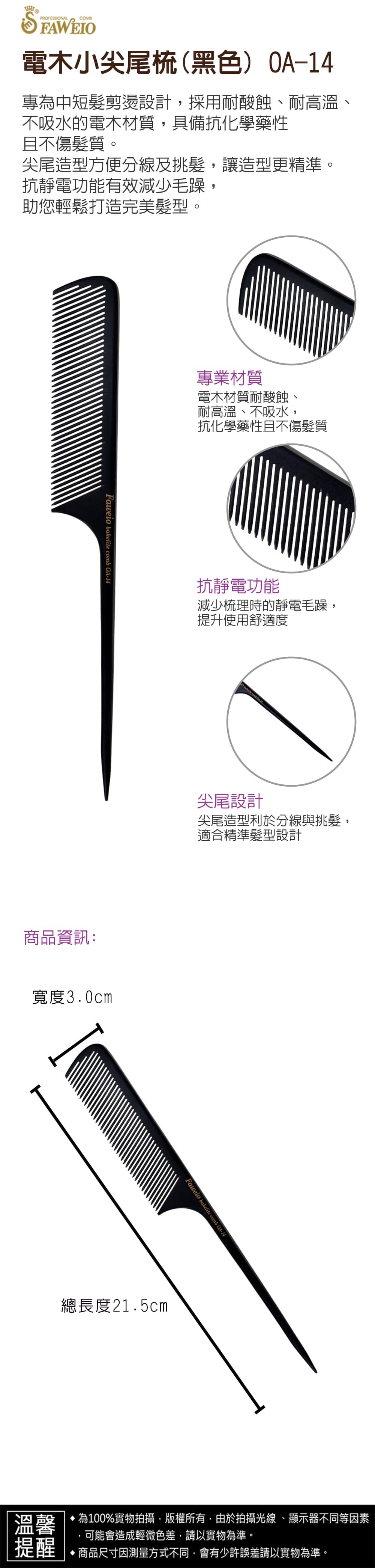 商品規格 : 品牌名稱 : 髮葳鵝 商品品名 : 電木小尖尾梳(黑色) OA-14 商品尺寸 : 總長度23.6cm x 寬3.0cm 商品材質 : 電木板