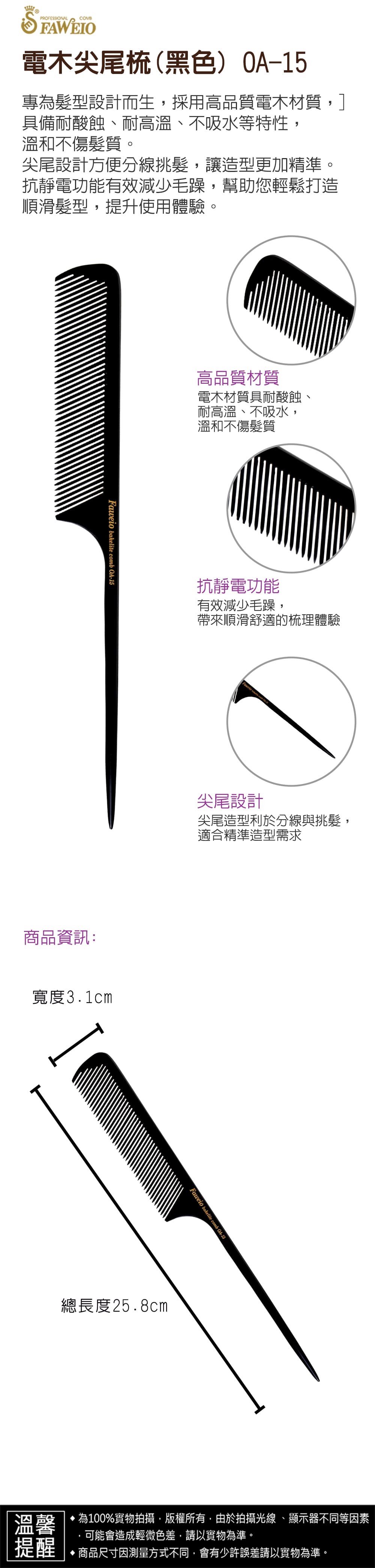 商品規格 : 品牌名稱 : 髮葳鵝 商品品名 : 電木尖尾梳(黑色) OA-15 商品尺寸 : 總長度25.8cm x 寬3.1cm