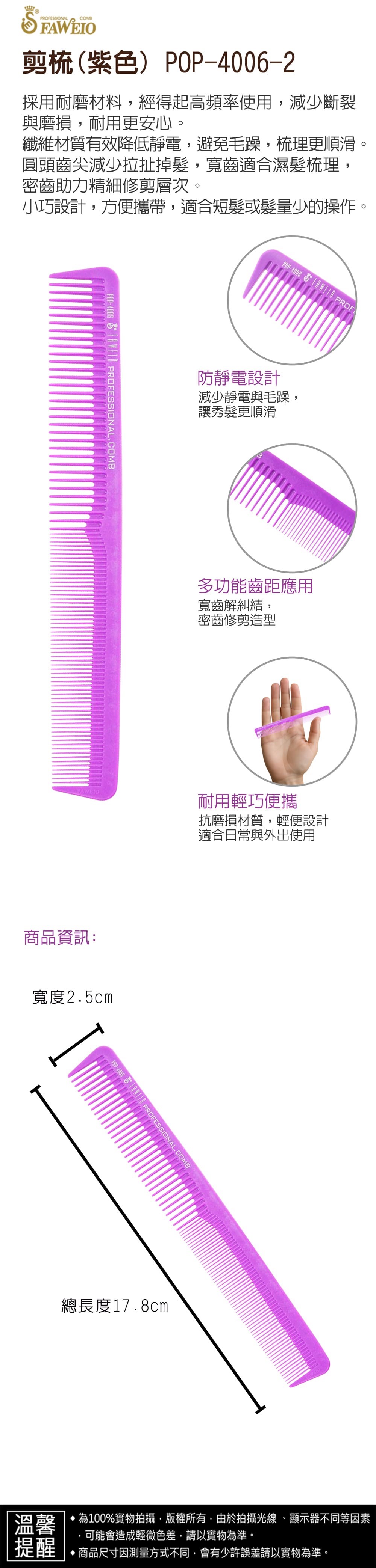 商品規格 : 品牌名稱 : 髮葳鵝 商品品名 : 剪梳(紫色) POP-4006-2 商品尺寸 : 總長度17.8cm x 寬2.5cm 商品材質 : 工程塑膠