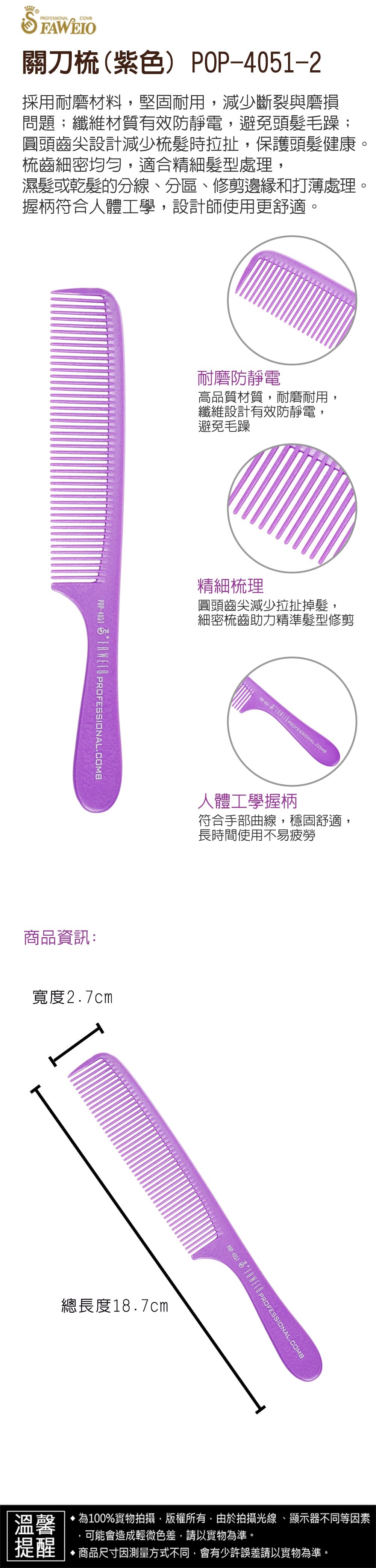 商品規格 : 品牌名稱 : 髮葳鵝 商品品名 : 關刀梳(紫色) POP-4051-2 商品尺寸 : 總長度18.7cm x 寬2.7cm 商品材質 : 工程塑膠