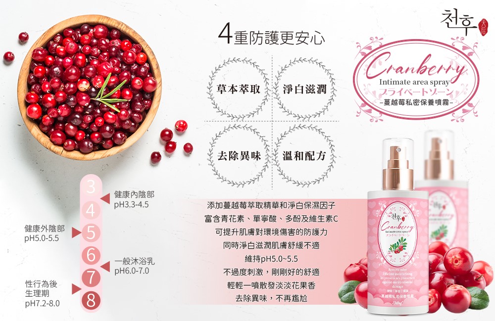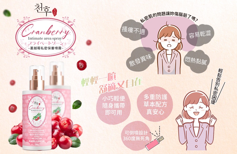 🍒蔓越莓私密保養噴霧採用蔓越莓提取物、天然草本植物等溫和配方,對私密處無刺激,安全有效👌