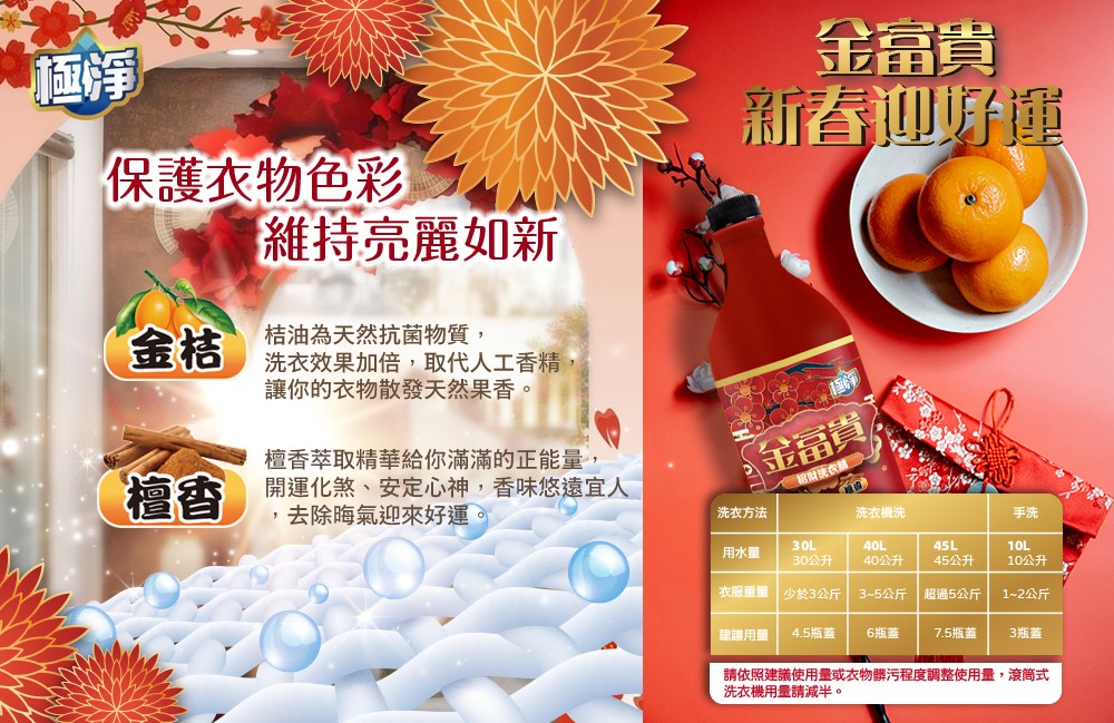 但迎新春 必有神器 金富貴 金桔檀香洗衣精 香氛/制菌/潔淨 檀香具有超強氣場及能量 幫助催財 提升陽氣及正能量 完美引財氣 金桔 讓您大吉又大利 金光閃閃好運到 檀香 清香 安定提神的功效 又可殺菌 金桔 天然去污力、殺菌力 雙效合而為一 讓您平安發財過好年