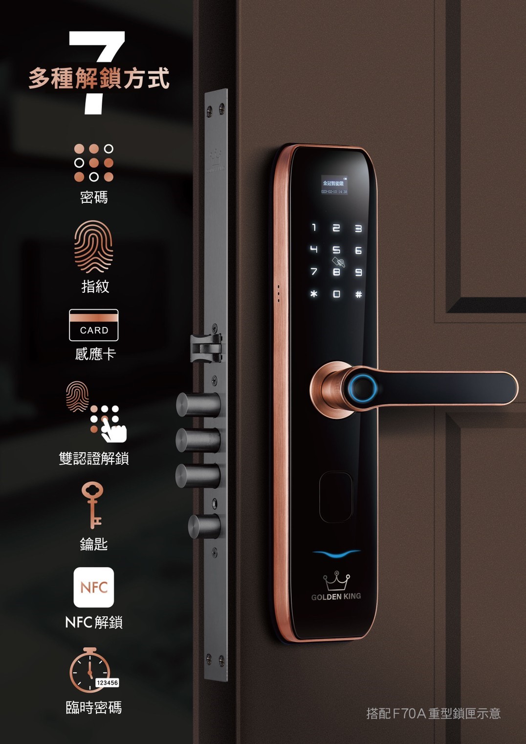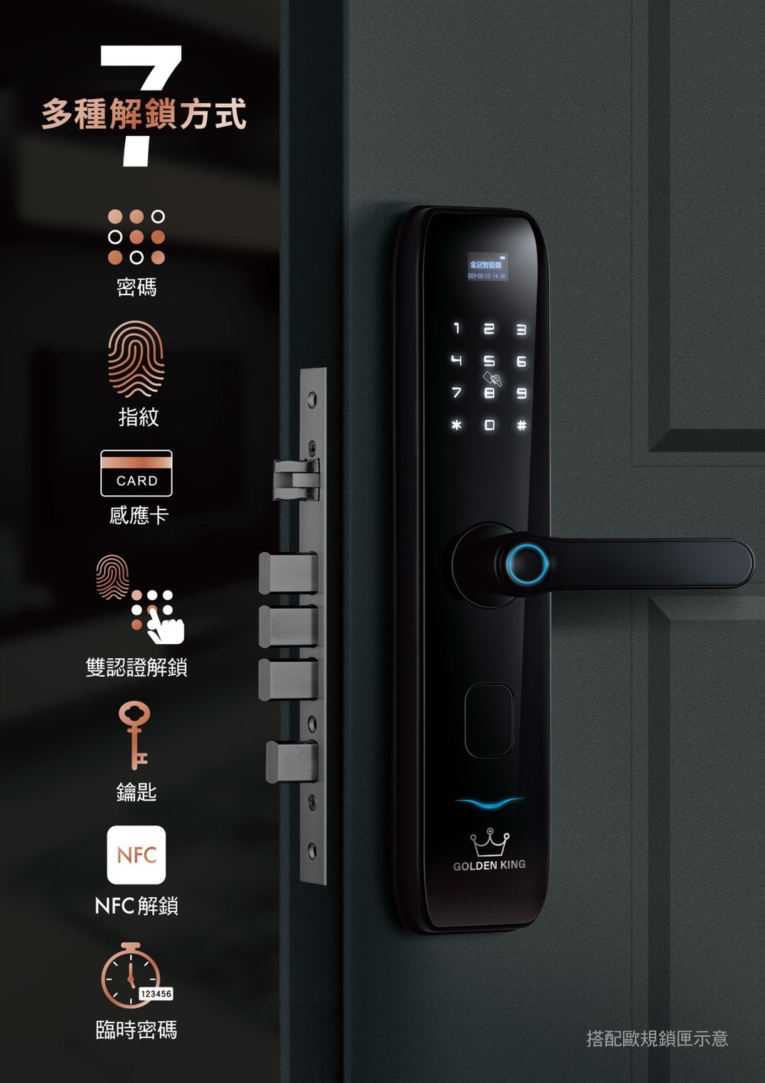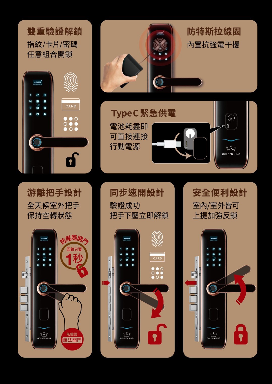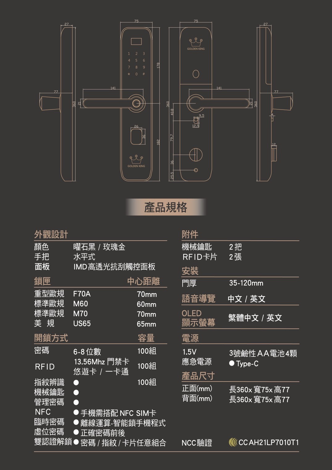 指紋(100枚)、密碼(100組)、卡片(100張)、備用鎖匙2支