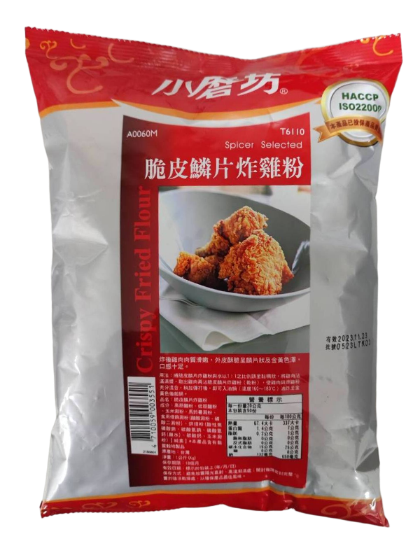 用法:將脆皮麟片炸雞粉與水以1:1之比例調至黏稠狀,將雞肉沾滿濕漿,