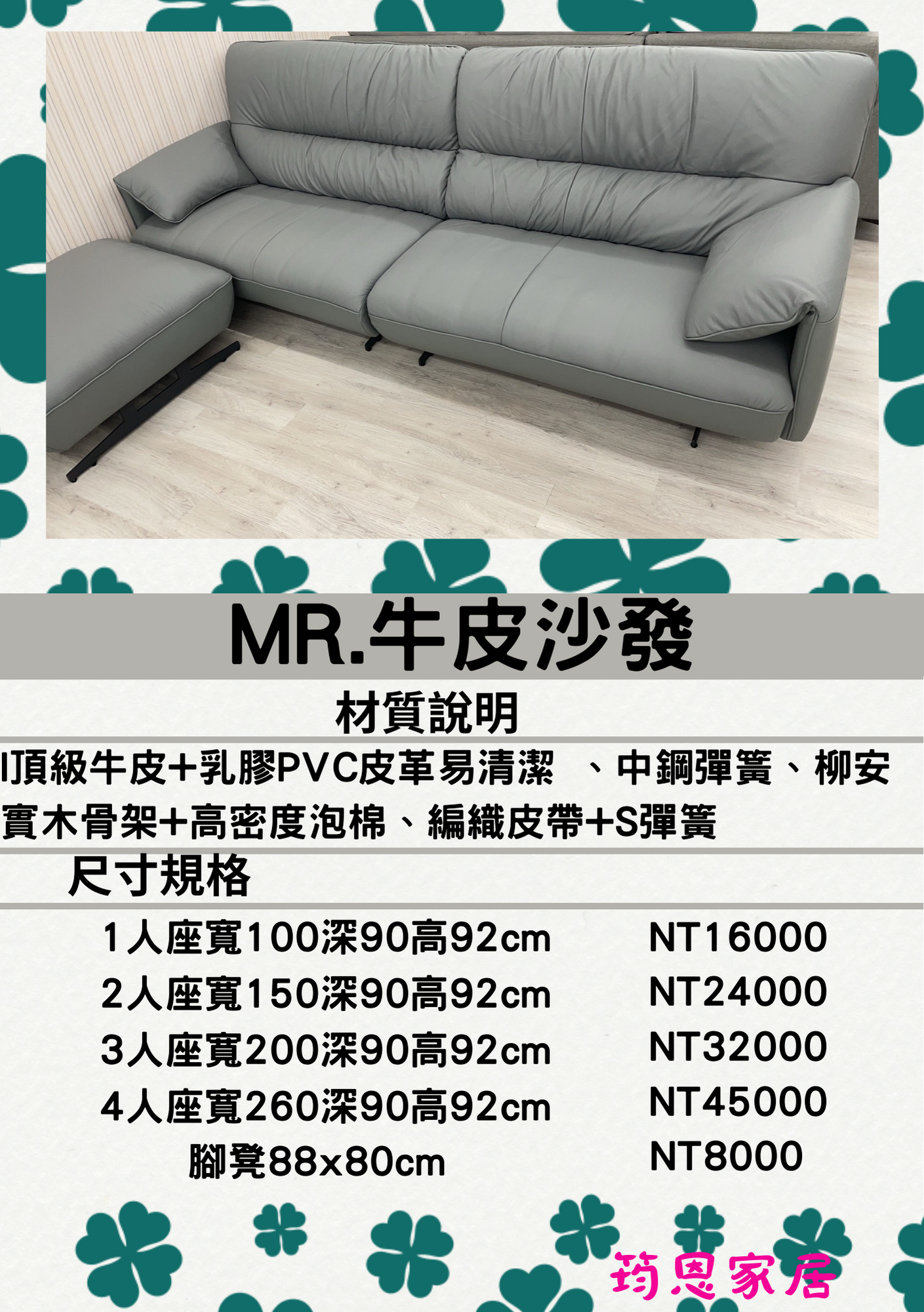 頂級牛皮+乳膠PVC皮革易清潔、中鋼彈簧、柳安實木骨架+高密度泡棉、編織皮帶+S彈簧