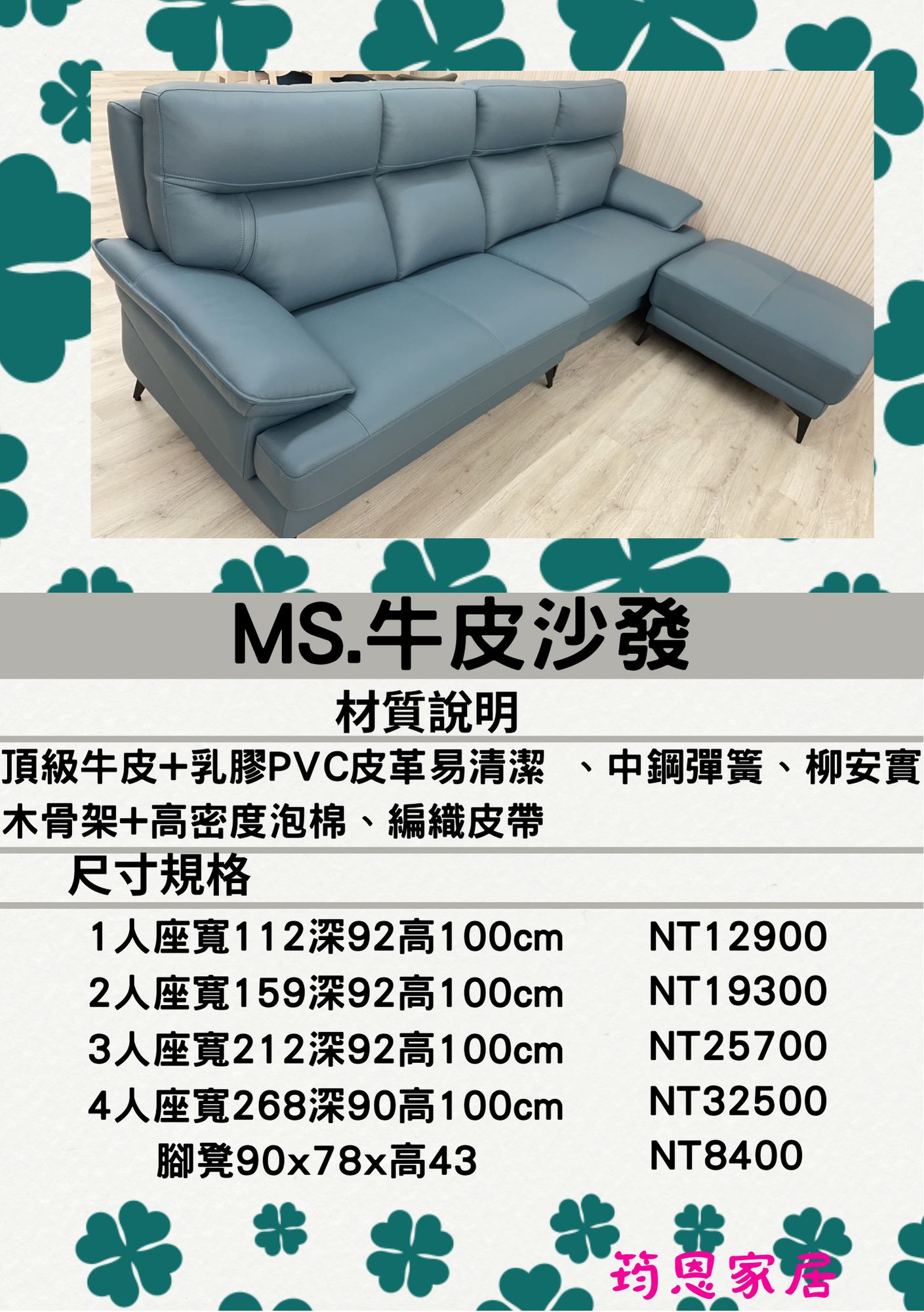 頂級牛皮+乳膠PVC皮革易清潔、中鋼彈簧、柳安實木骨架+高密度泡棉、編織皮帶
