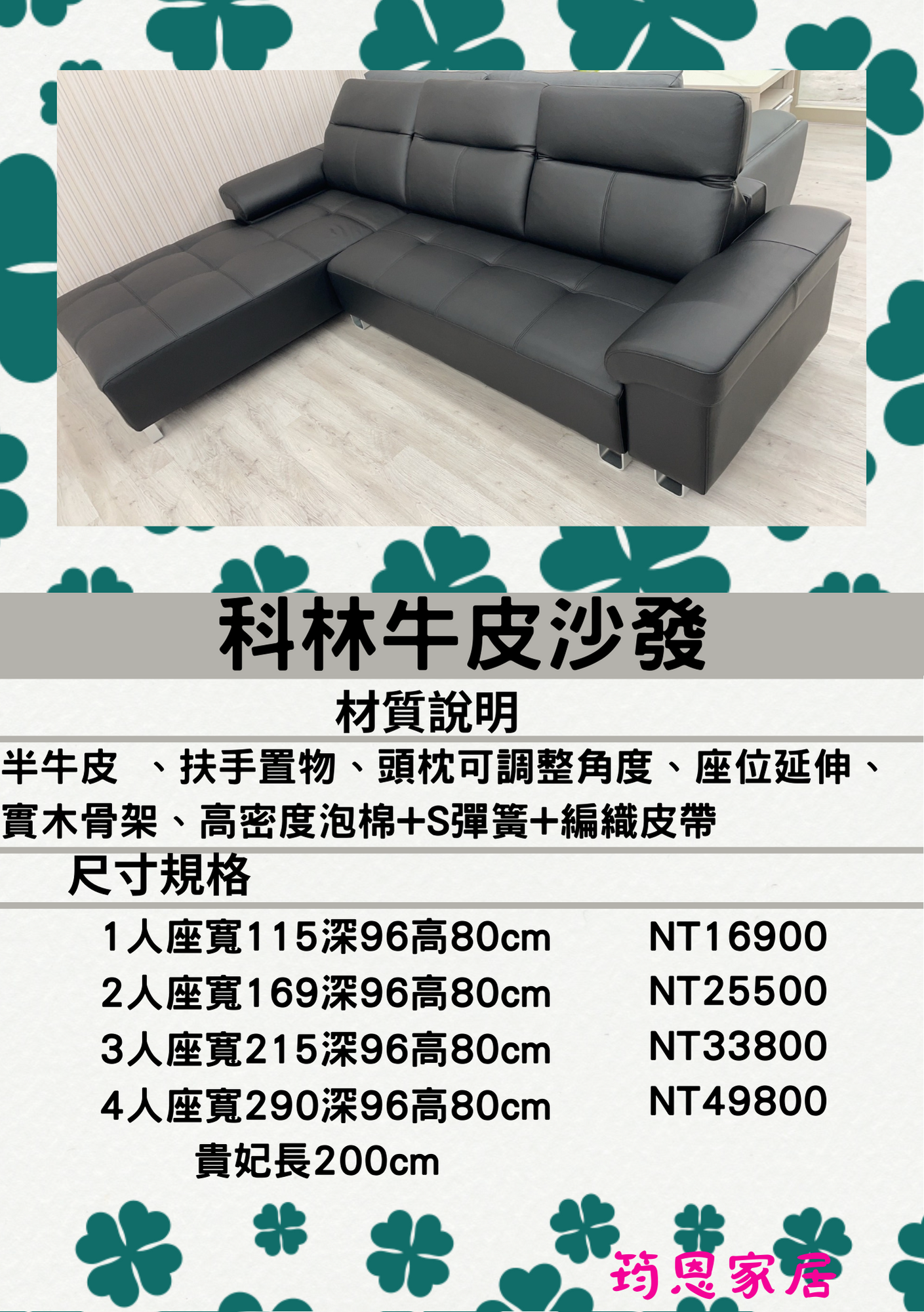 半牛皮、扶手置物、頭枕可調整角度、座位延伸、實木骨架、高密度泡棉+S彈簧+編織皮帶