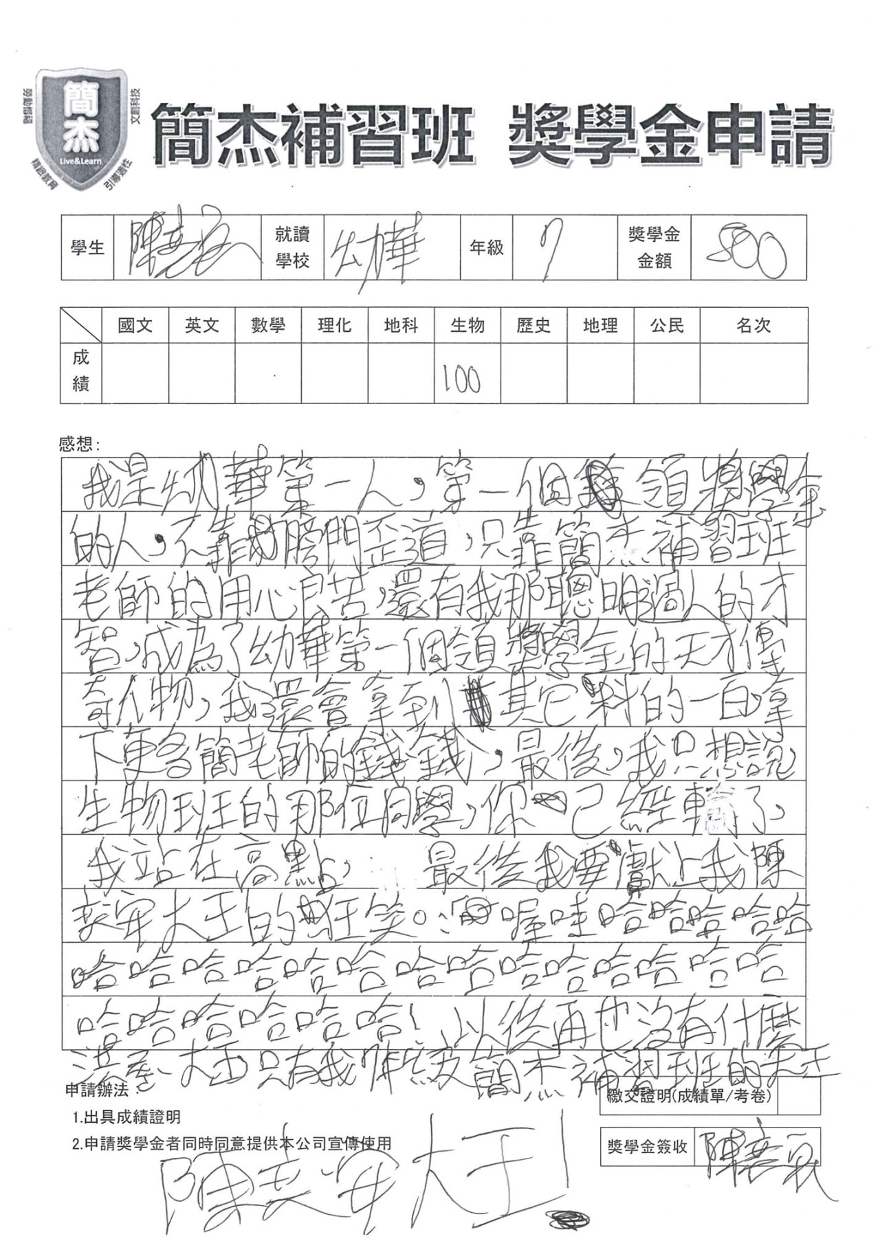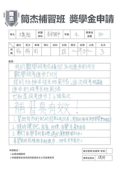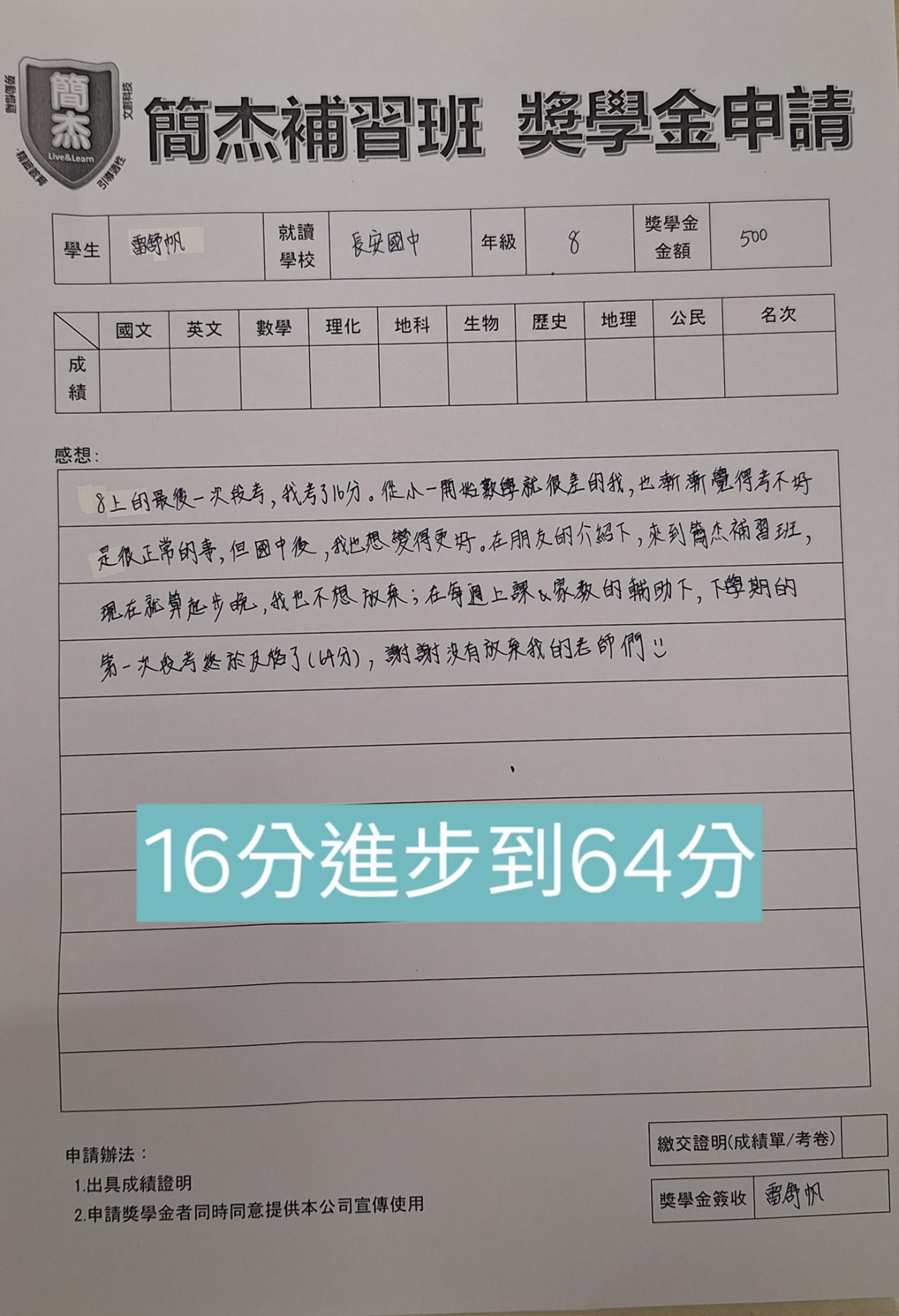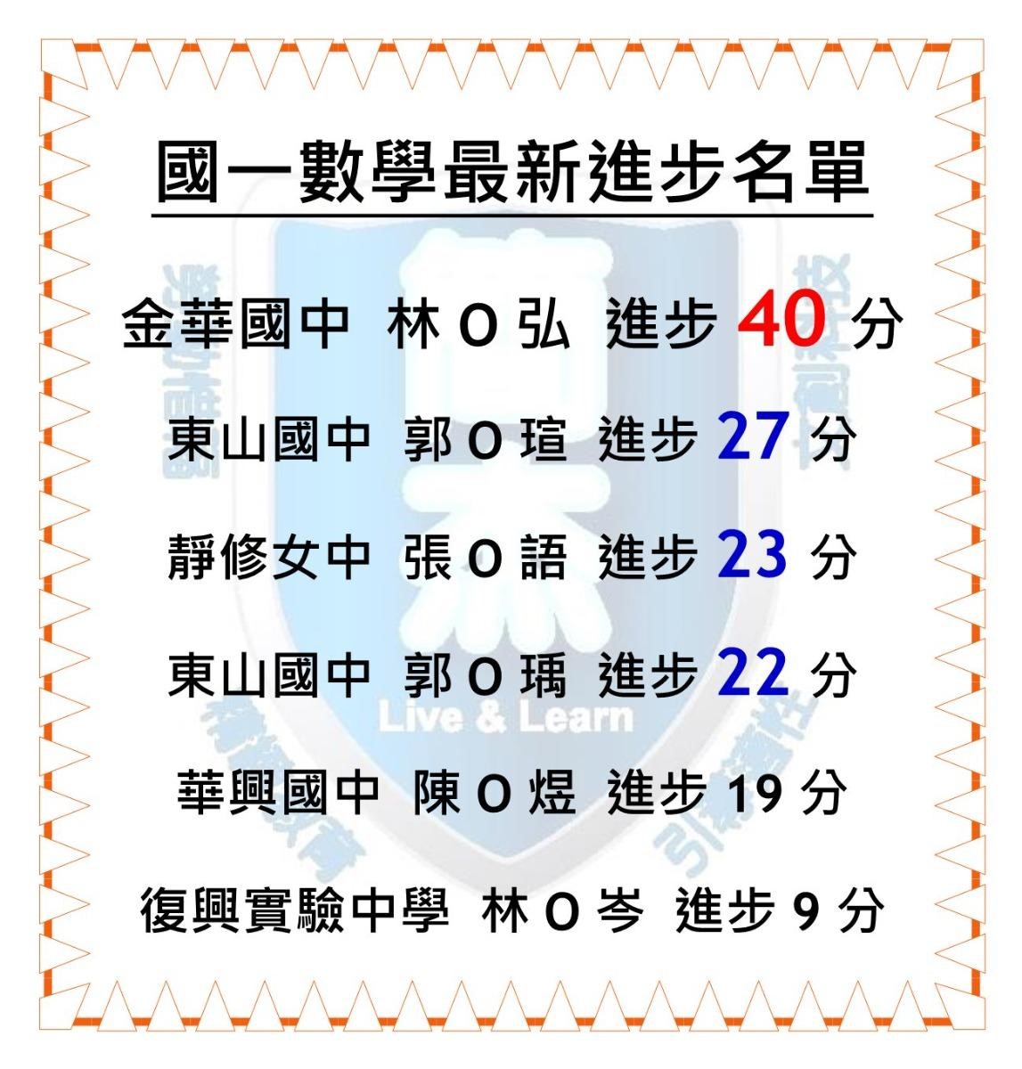 私立東山國中 數學84分進步到100分 陳*耀 私立新民國小畢業