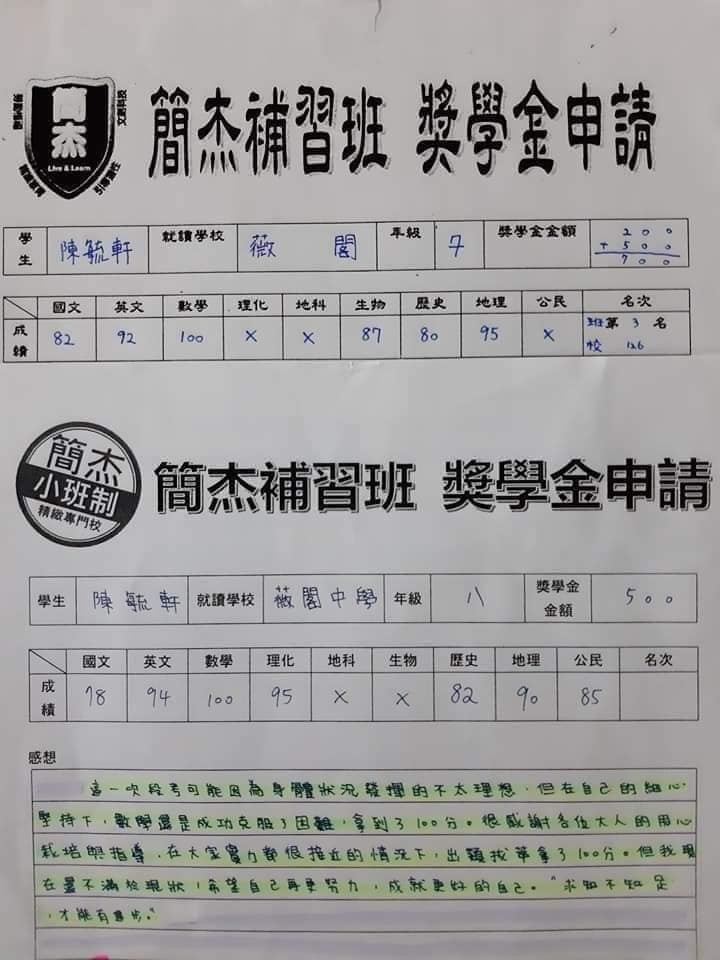 楊同學 開來簡杰補習之前段考40-60分 簡杰補習之後超過80分或90分 高中成績 數學全班最高分 班排第二名 全校年級排前5名