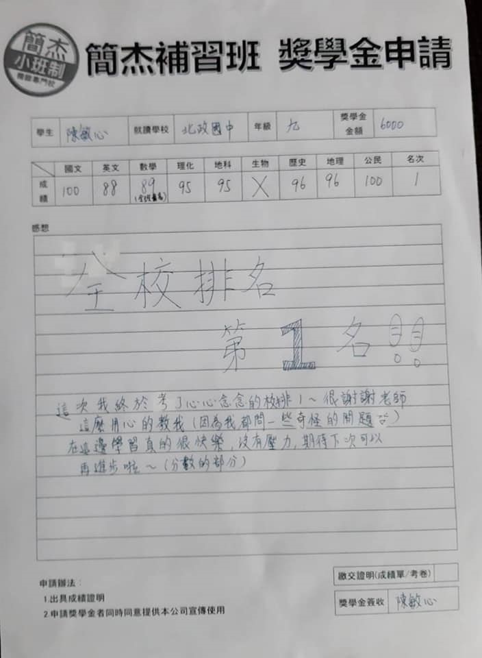 住大安區仁愛國中朱○榛 不理想分→96分→100分