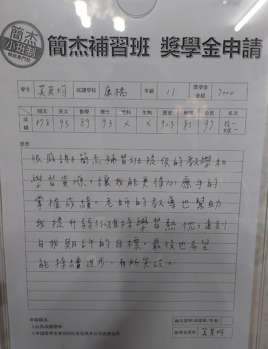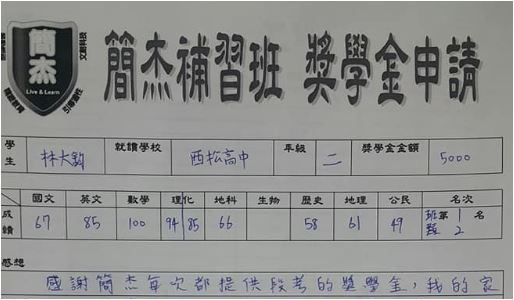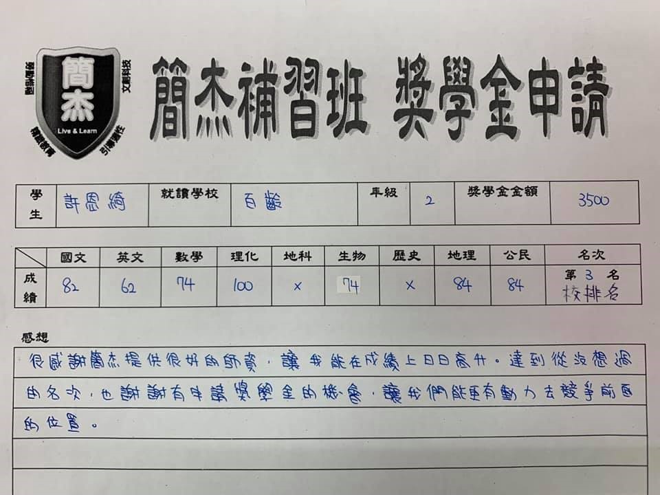 從同業轉來南山國八35 分,轉來簡杰後上過兩次課期末考數學63 分,